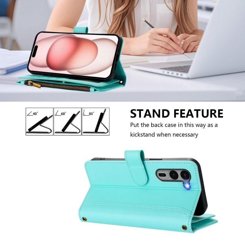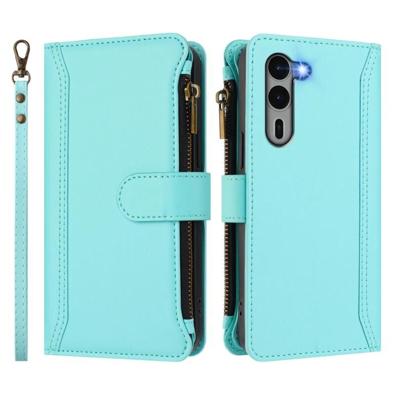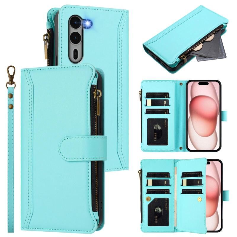 For Fujitsu Arrows We2 Plus Magnetic Closure 9 Card Slots Zipper Leather Case with Hand Strap(Mint Green)