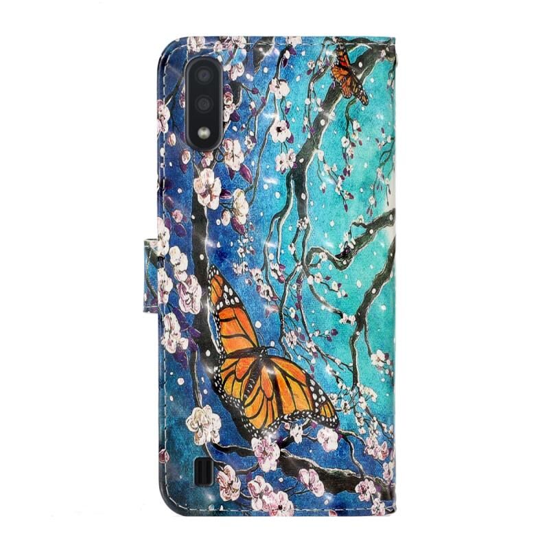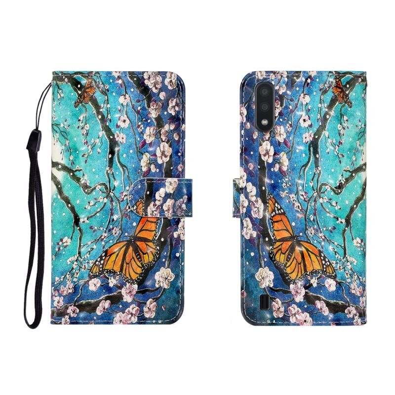 Θήκη δέρματος οριζόντιας αναδίπλωσης 3D με έγχρωμο σχέδιο για Galaxy A01 με βάση & υποδοχή κάρτας & πορτοφόλι (Χρυσή Πεταλούδα)