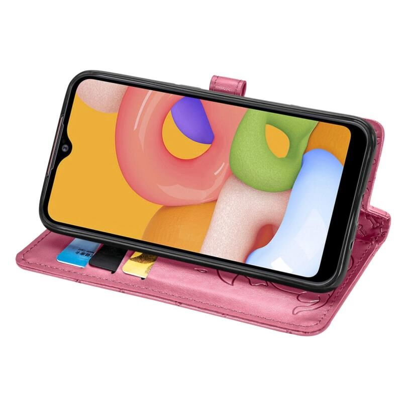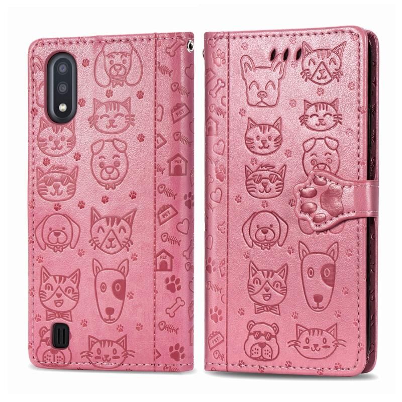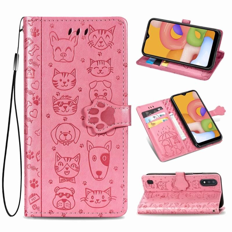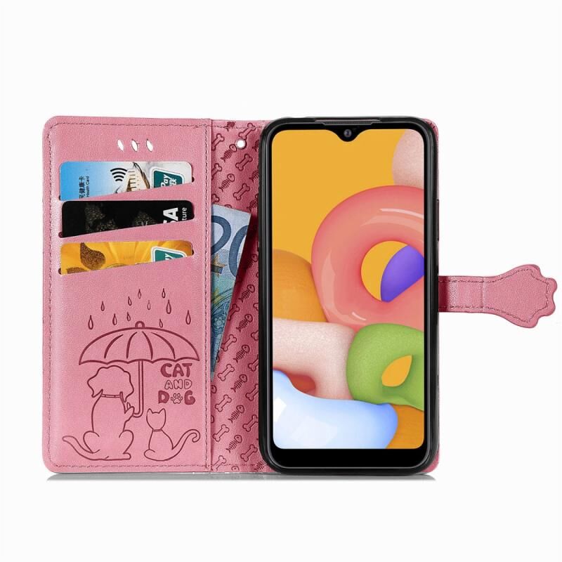 Θήκη δέρματος οριζόντιας αναδίπλωσης με ανάγλυφα σχέδια γατούλας και σκυλάκι για Galaxy A01, με βάση στήριξης / υποδοχή κάρτας / πορτοφόλι / κορδόνι (Ροζ)