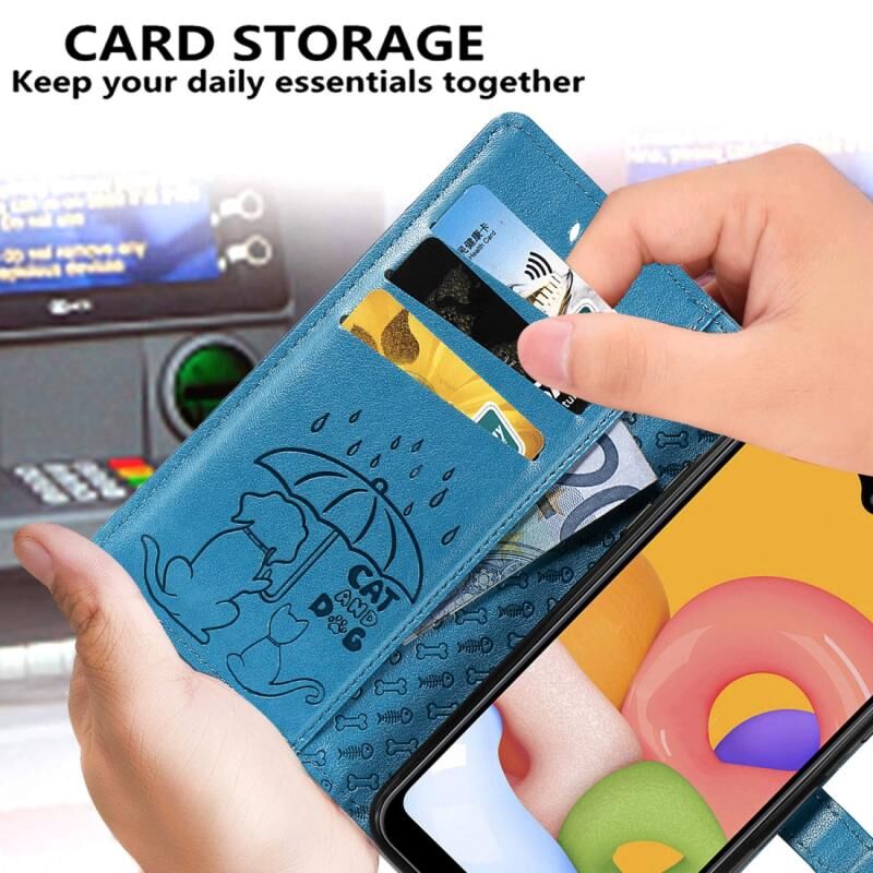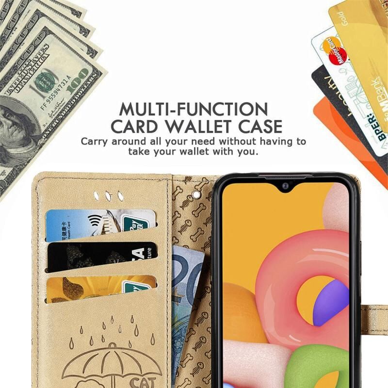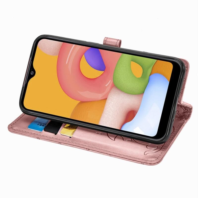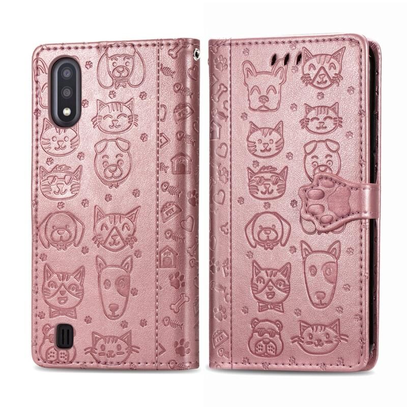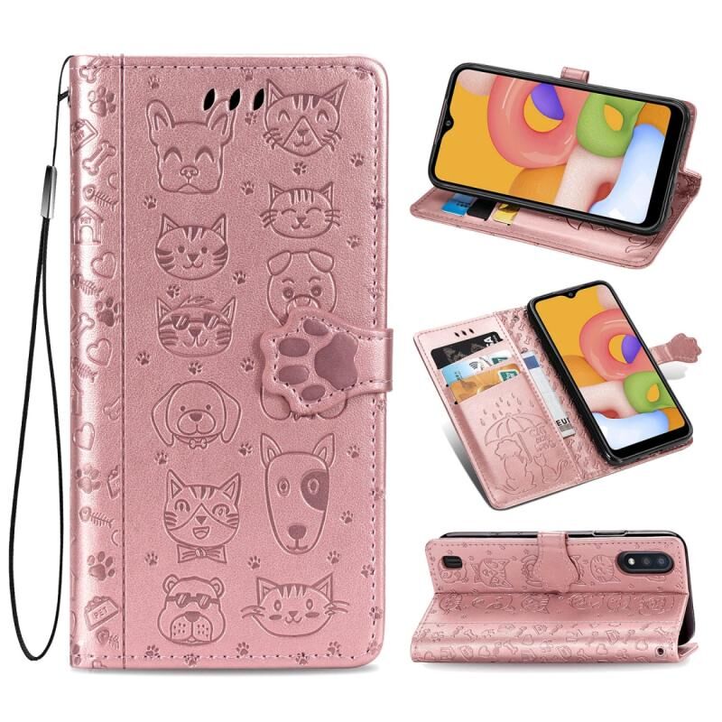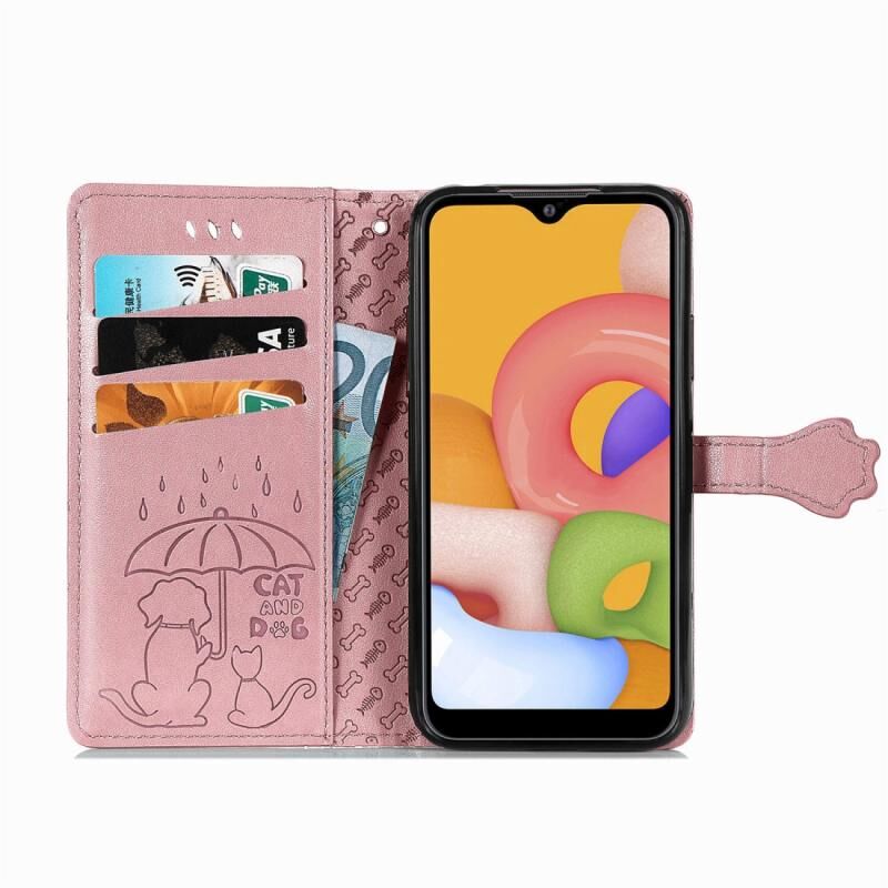 Θήκη δέρματος οριζόντιας αναδίπλωσης με ανάγλυφα σχέδια γατούλας και σκυλάκι για Galaxy A01, με βάση στήριξης / υποδοχή κάρτας / πορτοφόλι / κορδόνι (Ροζ)