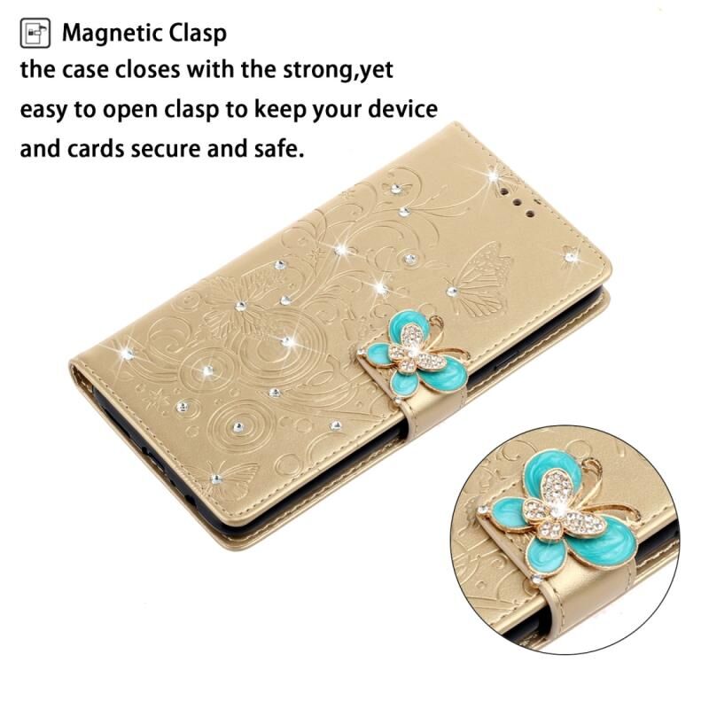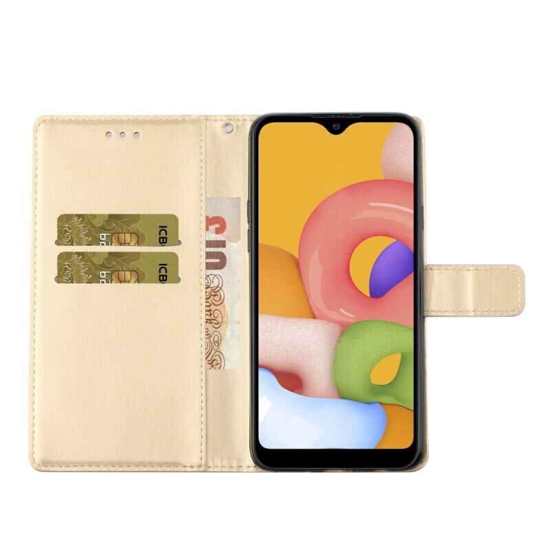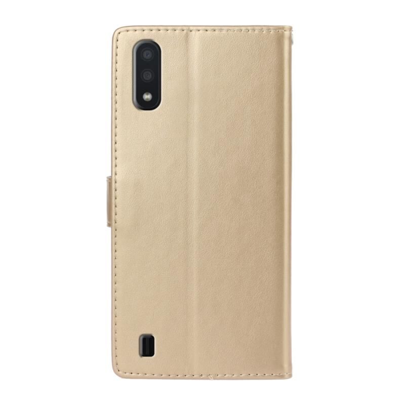 Θήκη δέρματος με ανάγλυφο σχέδιο πεταλούδας με στρασάκια για Galaxy A01, οριζόντια, με θήκη για κάρτες, πορτοφόλι και στήριξη (Χρυσός)