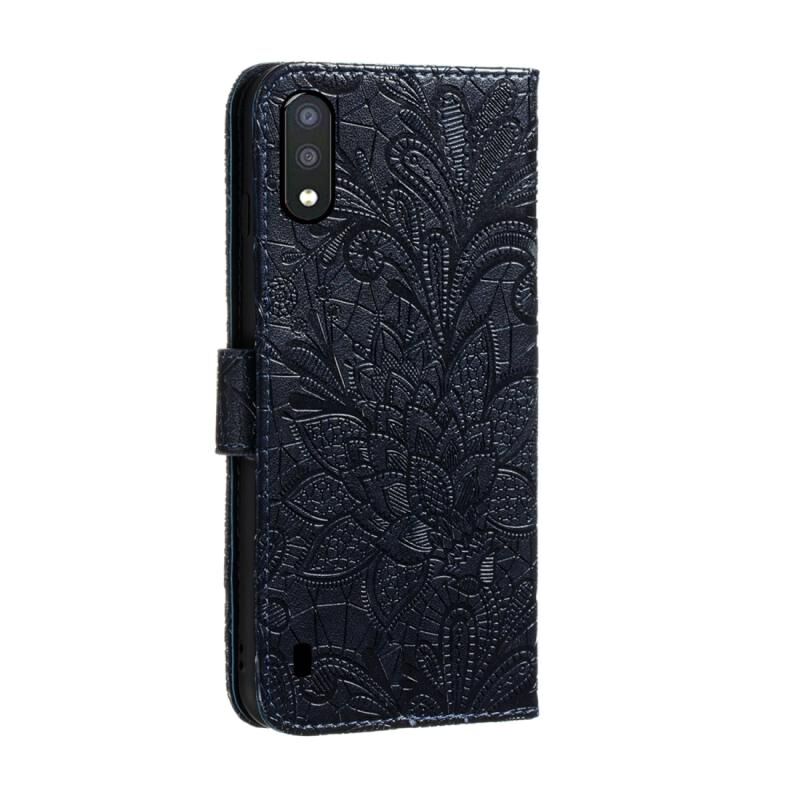 Θήκη για Galaxy A01, δερμάτινη οριζόντια με σχέδιο δαντέλας και λουλουδιών, με βάση, θήκες για κάρτες, πορτοφόλι, κορνίζα φωτογραφιών και κορδόνι (Σκούρο μπλε)