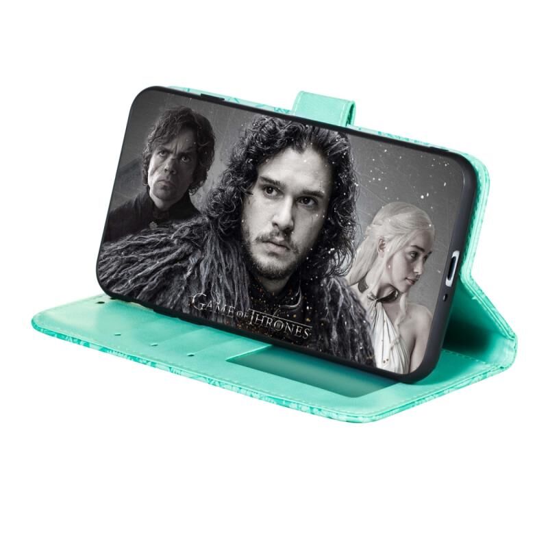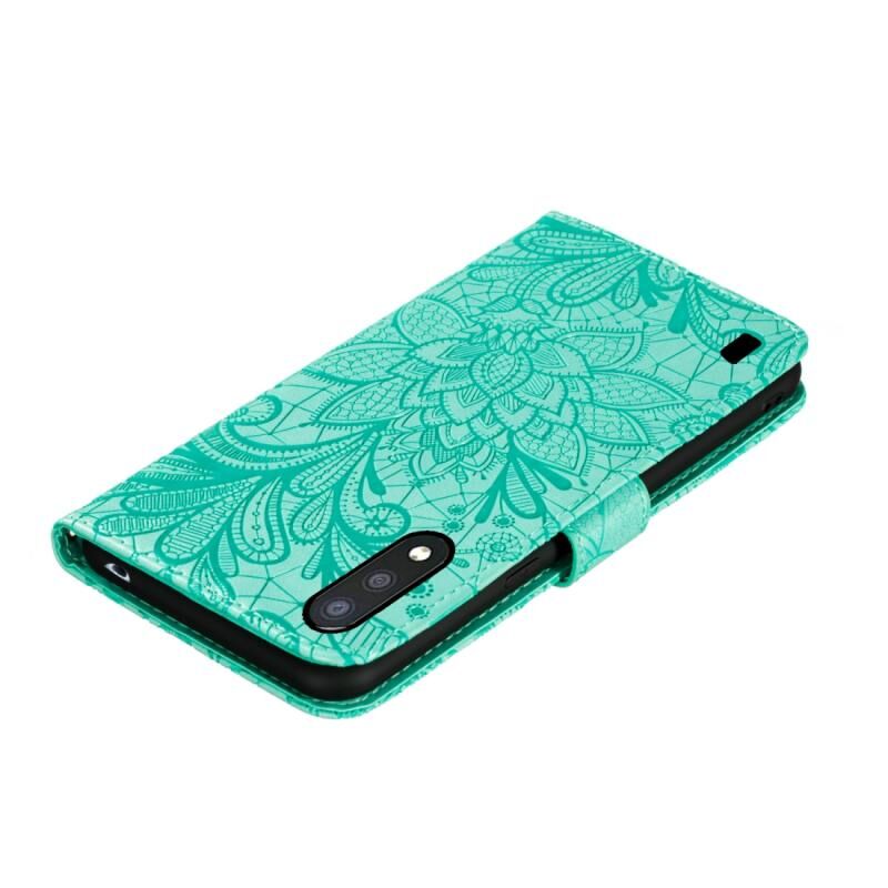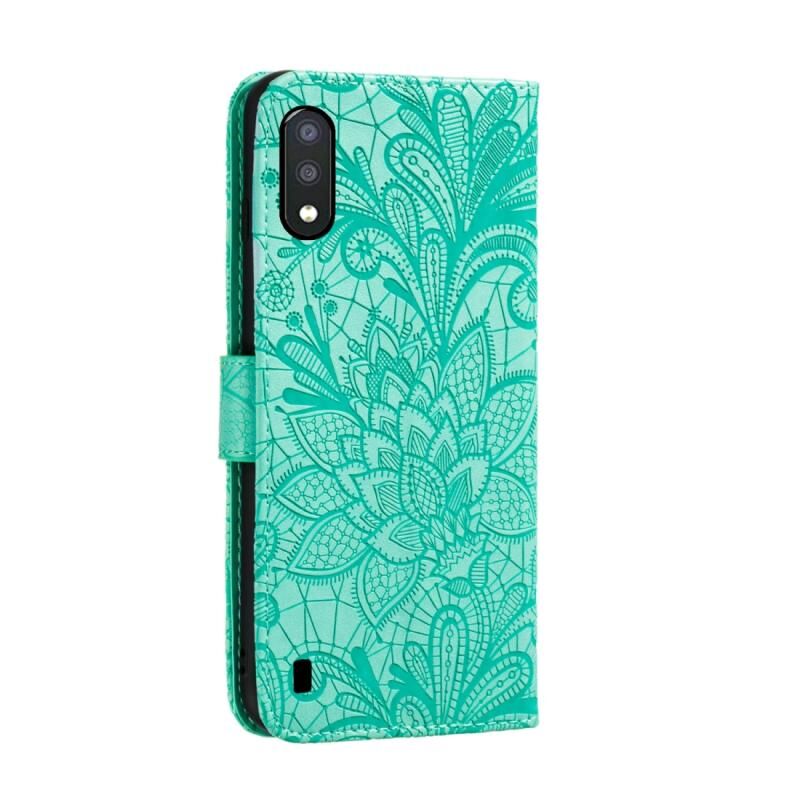 Θήκη για Galaxy A01, δερμάτινη οριζόντια με σχέδιο δαντέλας και λουλουδιών, με βάση, θήκες για κάρτες, πορτοφόλι, κορνίζα φωτογραφιών και κορδόνι (Χρυσό Ρόδινο). (πράσινο)