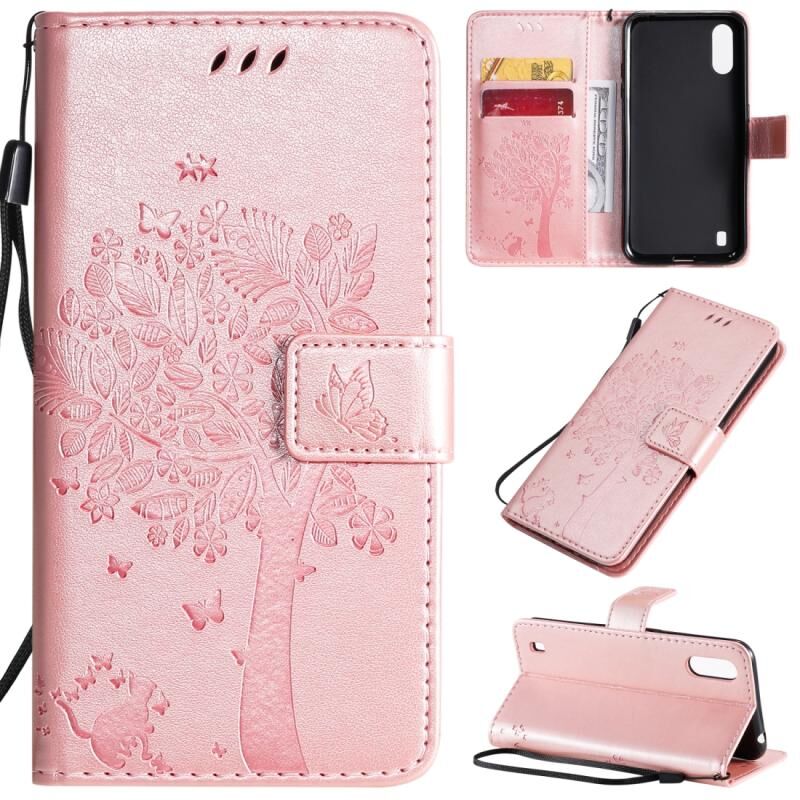 Θήκη για Galaxy A01 με σχέδιο Δέντρου & Γάτας, εκτύπωση με πίεση, οριζόντια, από δερματίνη PU με βάση & θήκες για κάρτες & πορτοφόλι & κορδόνι (Πράσινο)