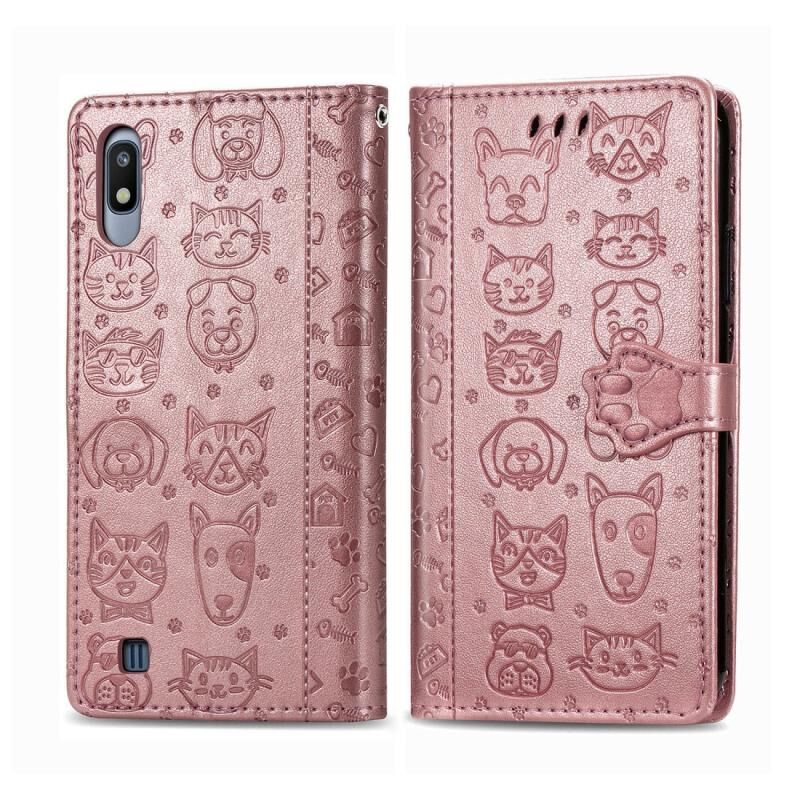 Θήκη δέρματος οριζόντιας αναδίπλωσης με ανάγλυφα σχέδια γατούλας και σκυλάκι για Galaxy A10, με βάση στήριξης / υποδοχή κάρτας / πορτοφόλι / κορδόνι (Χρυσό Ρόδι)