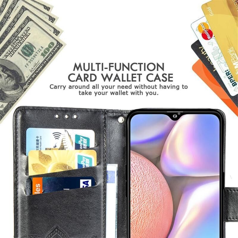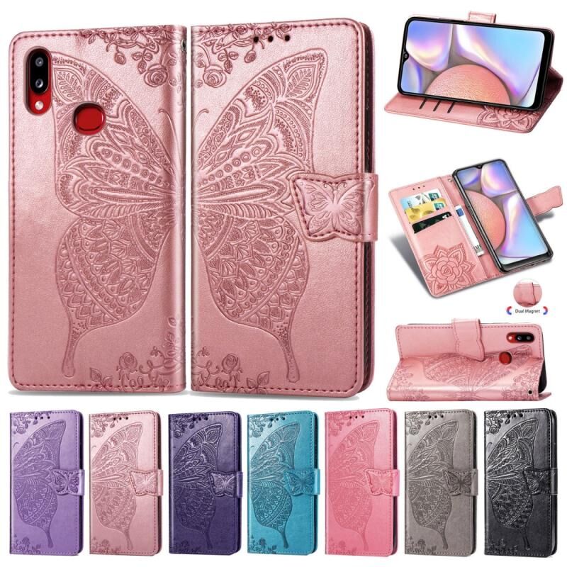 Θήκη βιβλίου από δέρμα με οριζόντιο άνοιγμα για Galaxy A10s με ανάγλυφο σχέδιο πεταλούδας, λουλουδιών, βάση στήριξης, θήκες για κάρτες, πορτοφόλι και κορδόνι (Μαύρο)
