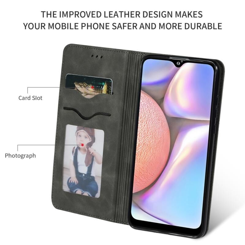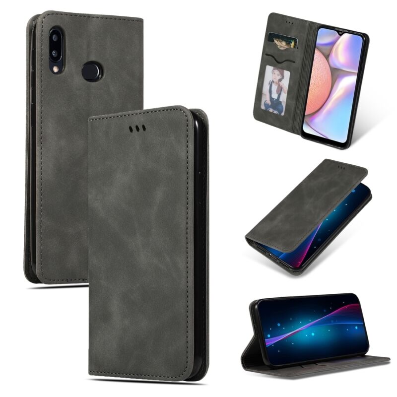 Για Galaxy A10S Retro δέρμα αίσθηση Business μαγνητική οριζόντια Flip δερμάτινη θήκη (σκούρο γκρι)