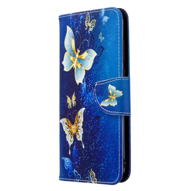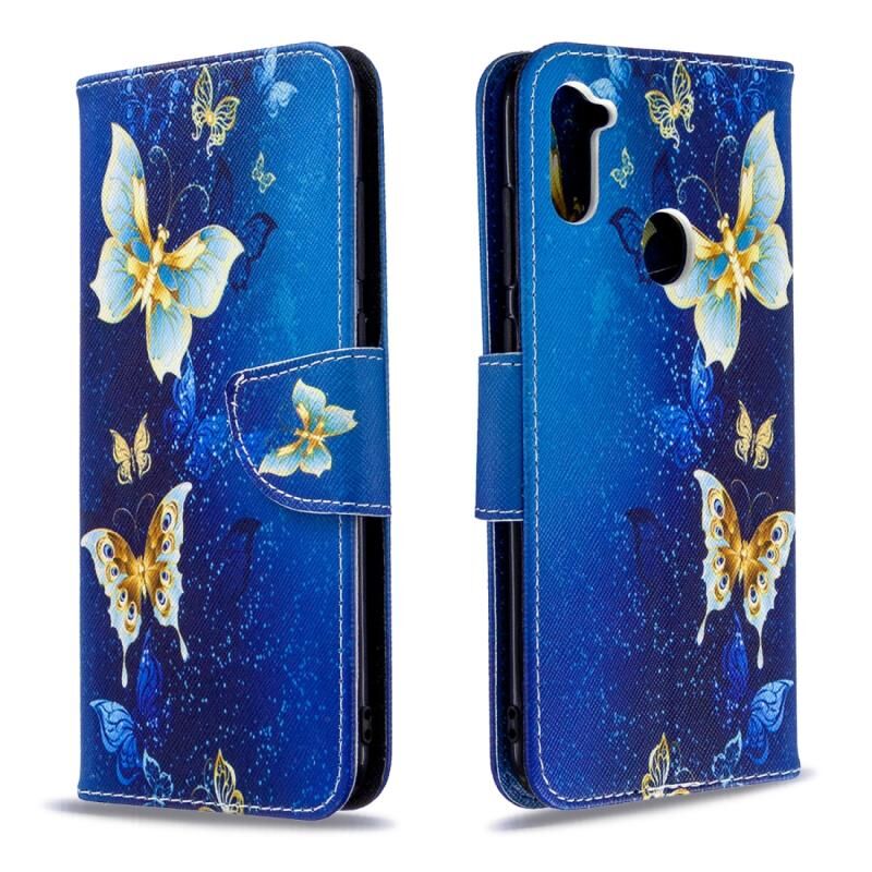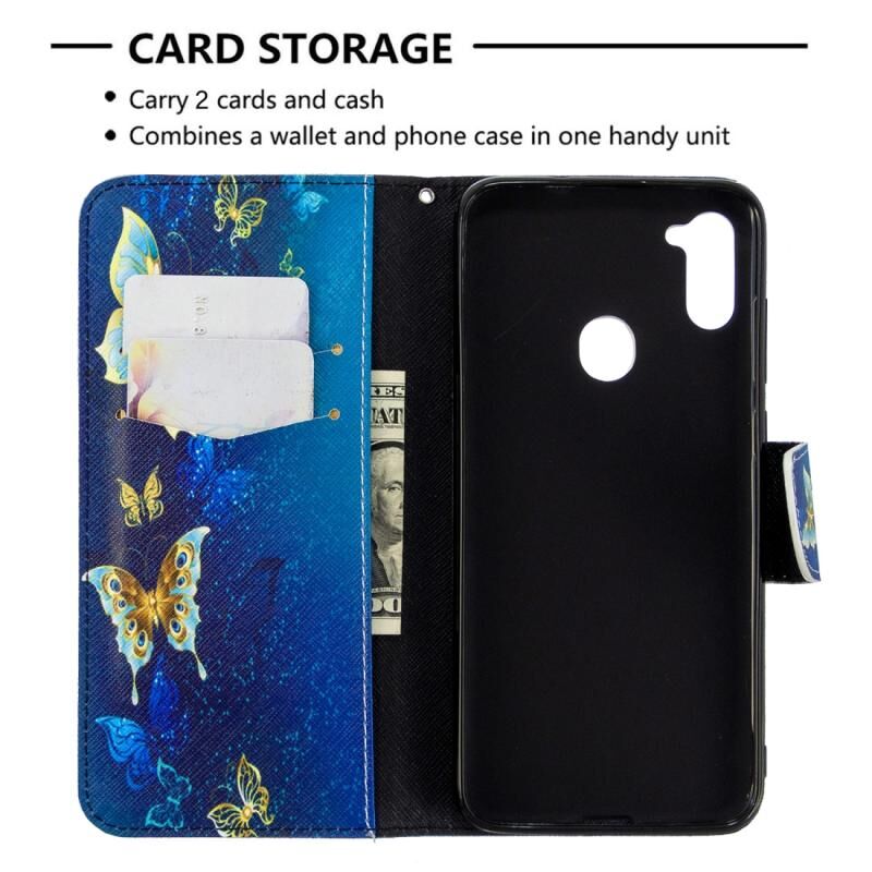 Θήκη δέρματος οριζόντιας αναδίπλωσης με σχέδιο για Galaxy A11 σε χρυσό χρώμα (Χρυσή Πεταλούδα) με βάση & υποδοχές καρτών & πορτοφόλι.