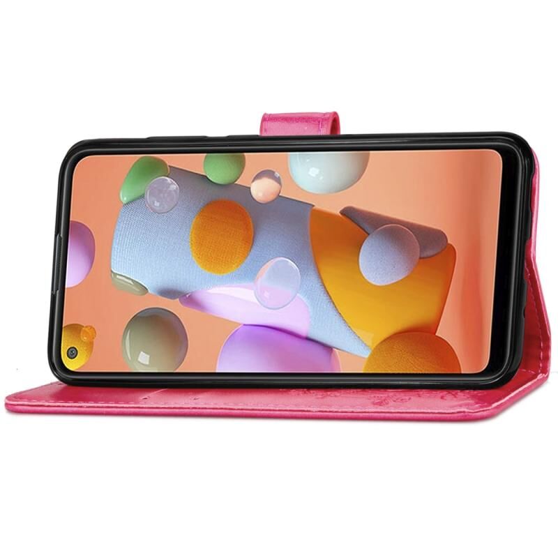 Για Galaxy A11 Θήκη Προστασίας Δερμάτινη για Κινητό με Κούμπωμα Τριφύλλι, ανάγλυφο, με Λουρί, Θήκη Καρτών, Πορτοφόλι & Λειτουργία Στήριξης (ματζέντα)