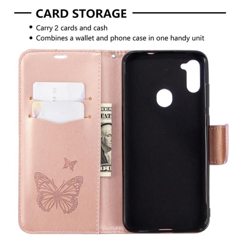 Θήκη βιβρίου από δέρμα με οριζόντιο άνοιγμα για Galaxy A11 με σχέδιο δύο πεταλούδων σε ανάγλυφο, με βάση, θήκη για κάρτες, πορτοφόλι και κορδόνι (Ροζ χρυσός)