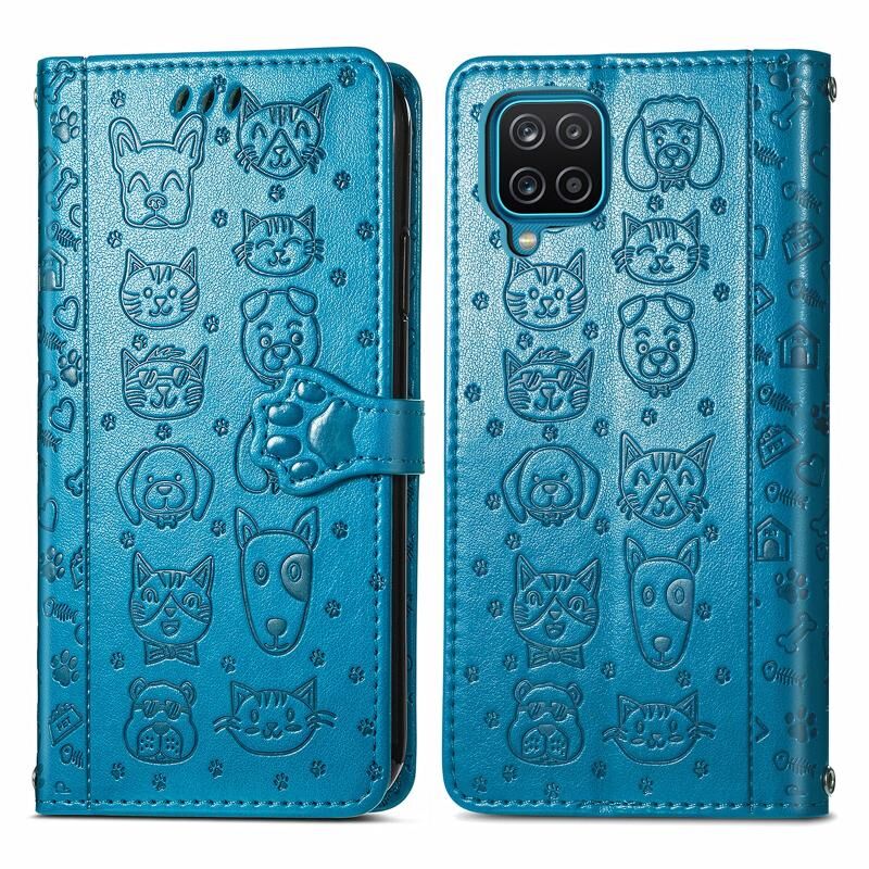 Για Galaxy A12 Χαριτωμένη γάτα και σκύλος ανάγλυφη οριζόντια Flip δερμάτινη θήκη με θήκη & υποδοχές για κάρτες & πορτοφόλι & κορδόνι (μπλε)