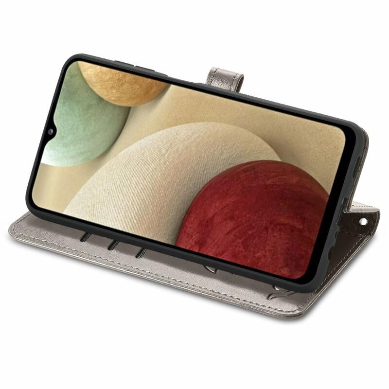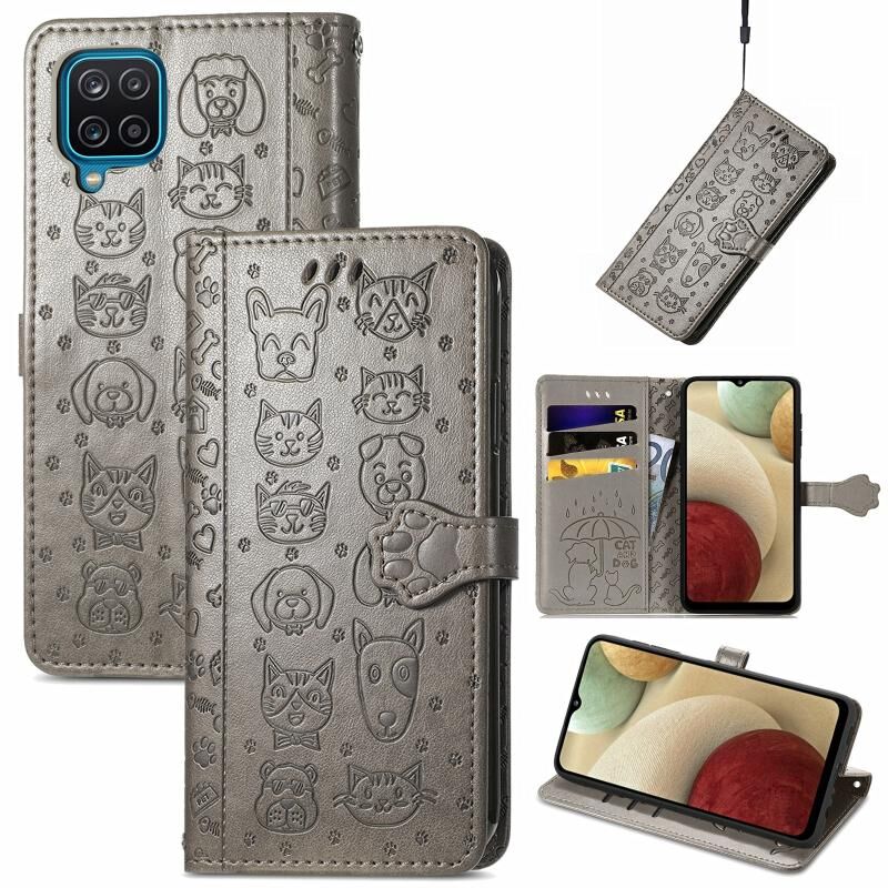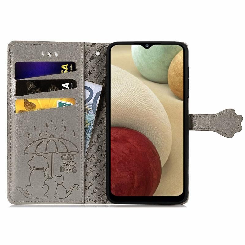 Για Galaxy A12 Χαριτωμένη γάτα και σκύλος ανάγλυφη οριζόντια Flip δερμάτινη θήκη με θήκη & υποδοχές για κάρτες & πορτοφόλι & κορδόνι (γκρι)