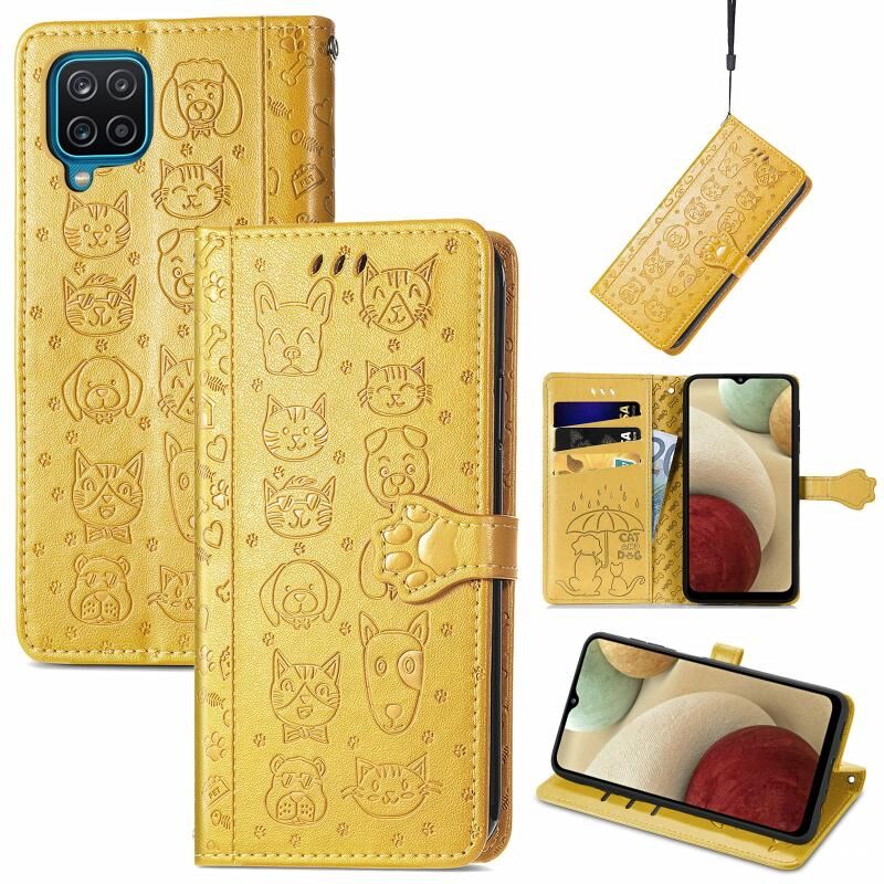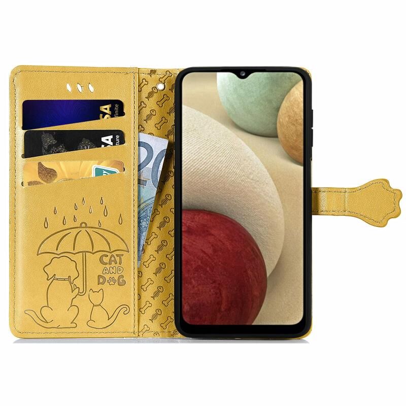 Για Galaxy A12 Χαριτωμένη γάτα και σκύλος ανάγλυφη οριζόντια Flip δερμάτινη θήκη με θήκη & υποδοχές για κάρτες & πορτοφόλι & κορδόνι (κίτρινο)