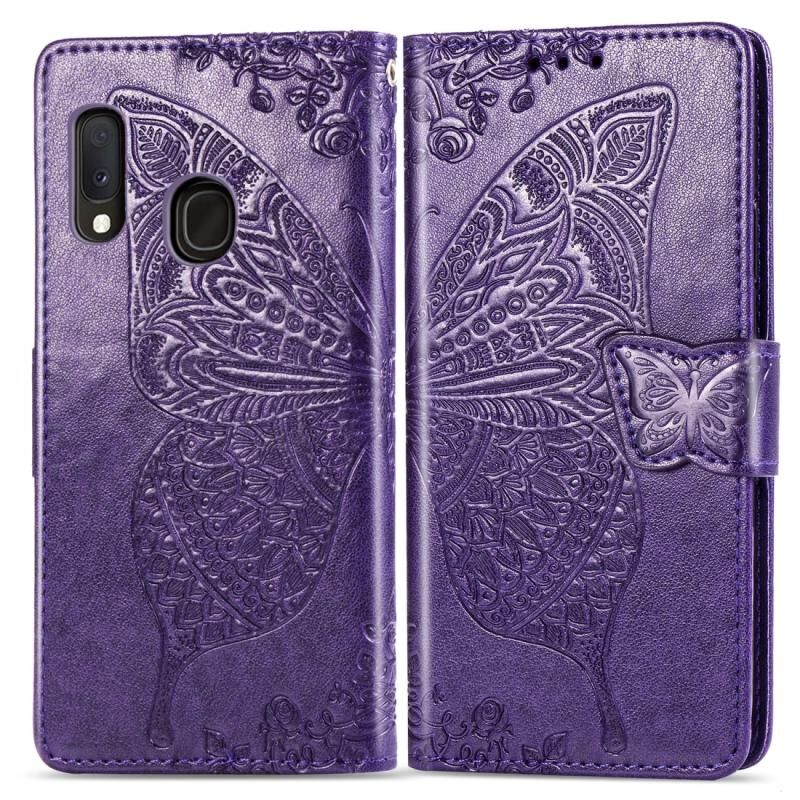 Για Galaxy A20e πεταλούδα αγάπη λουλούδια ανάγλυφο οριζόντια Flip δερμάτινη θήκη με κάτοχο & υποδοχές για κάρτες & πορτοφόλι & κορδόνι (σκούρο μοβ)