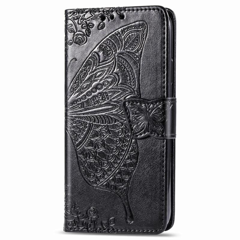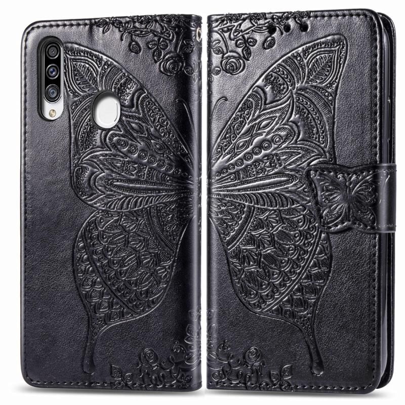 Θήκη βιβλίου από δέρμα με οριζόντιο άνοιγμα για Galaxy A20S με ανάγλυφο σχέδιο πεταλούδας και λουλουδιών, με βάση στήριξης / υποδοχή κάρτας / πορτοφόλι / κορδόνι (Μαύρο)