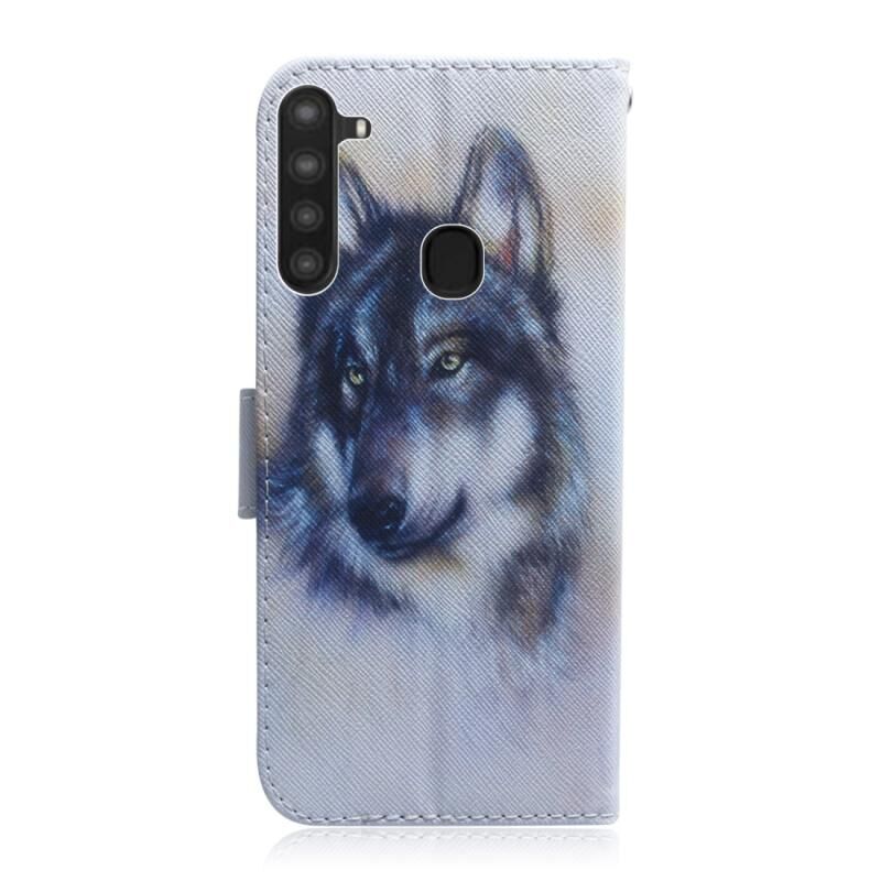 Θήκη δέρματος οριζόντιας αναδίπλωσης 3D με έγχρωμο σχέδιο για Galaxy A21 με βάση & υποδοχή κάρτας & πορτοφόλι (Λύκος)