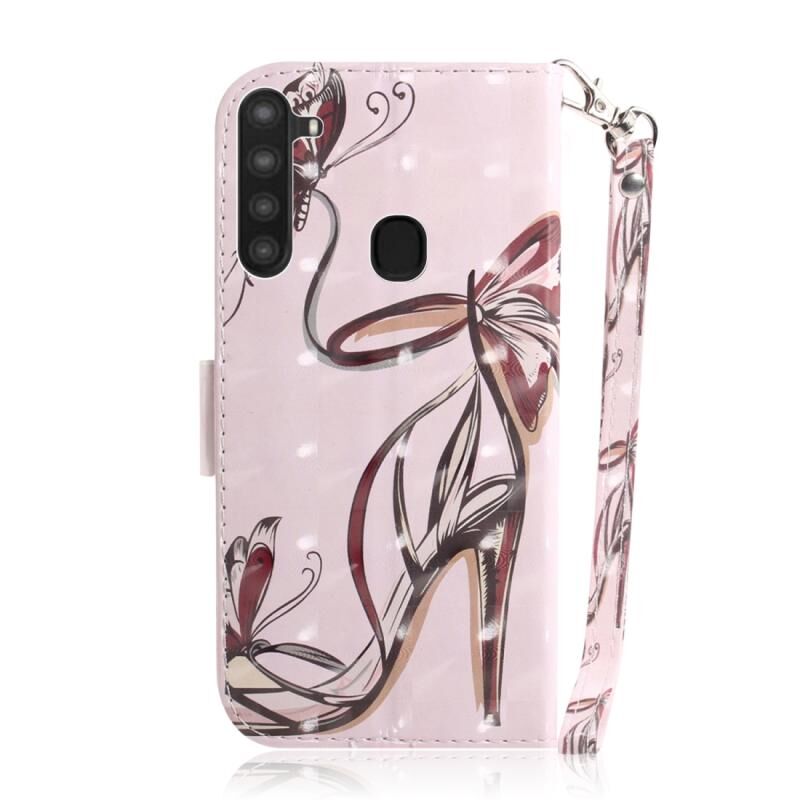 Θήκη δέρματος οριζόντιας αναδίπλωσης με τρισδιάστατη ζωγραφική για Galaxy A21 με βάση, θήκη για κάρτες, πορτοφόλι και λουρί (πεταλούδα και ψηλοτάκουνα).