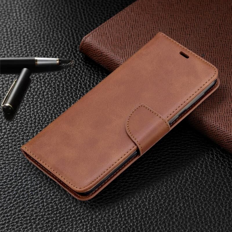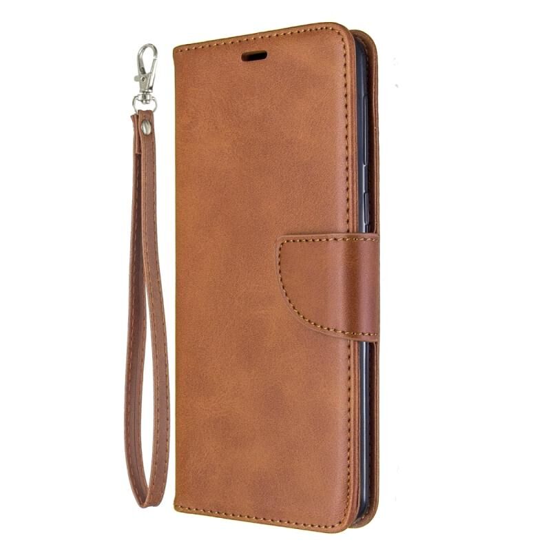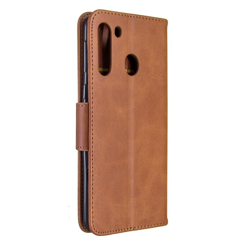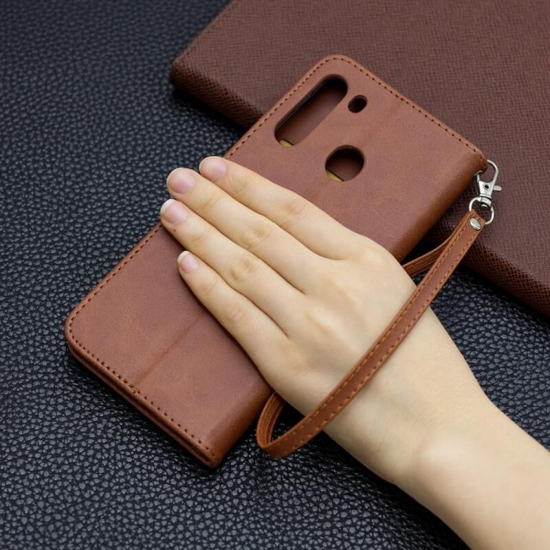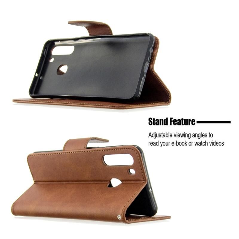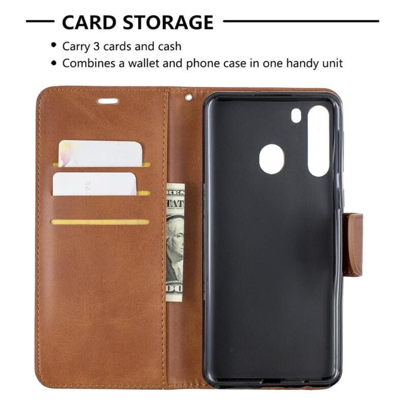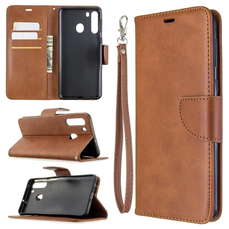 Για Galaxy A21 Retro Lambskin υφή καθαρό χρώμα οριζόντια Flip PU δέρμα υπόθεση με θήκη & υποδοχές για κάρτες & πορτοφόλι & κορδόνι (καφέ)