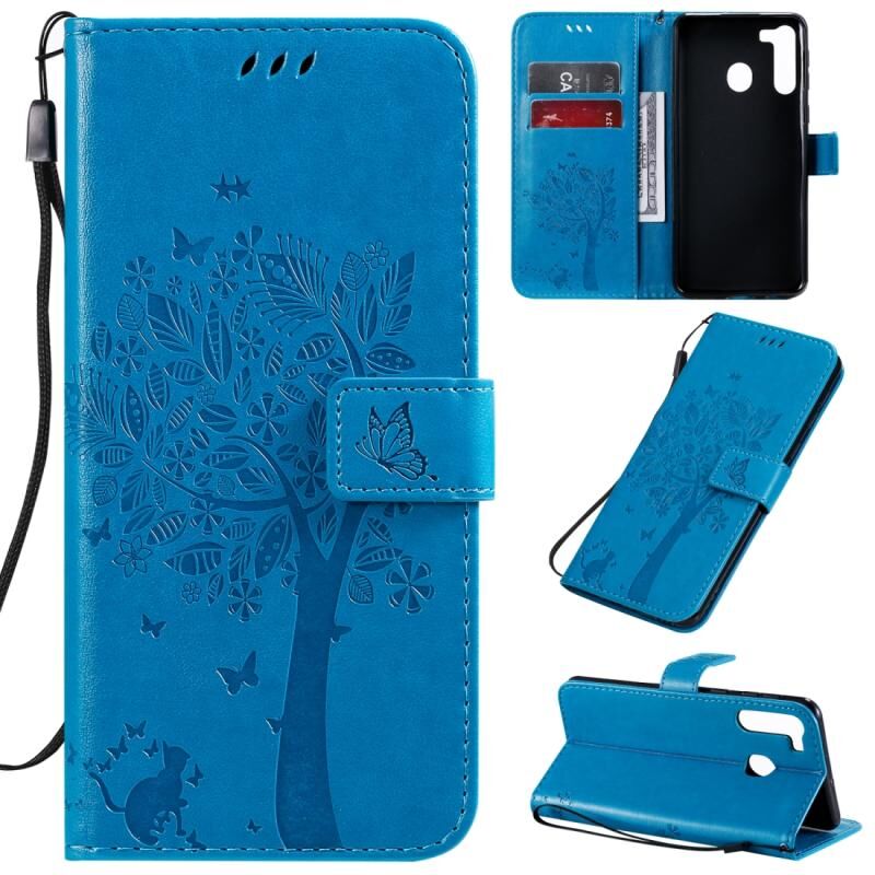 Θήκη για Galaxy A21 με σχέδιο Δέντρου & Γάτας, εκτύπωση με πίεση, οριζόντια, από δερματίνη PU με βάση & θήκες καρτών & πορτοφόλι & κορδόνι (Μπλε)