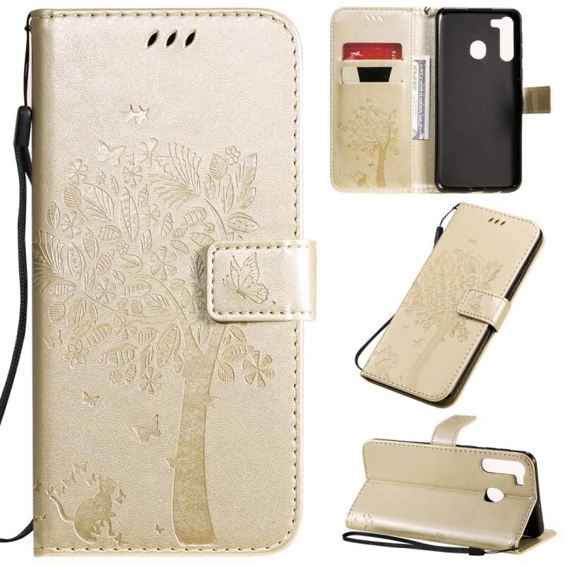 Θήκη για Galaxy A21 με σχέδιο Δέντρου & Γάτας, εκτύπωση με πίεση, οριζόντια, από δερματίνη PU με βάση & θήκες καρτών & πορτοφόλι & κορδόνι (Πράσινο)