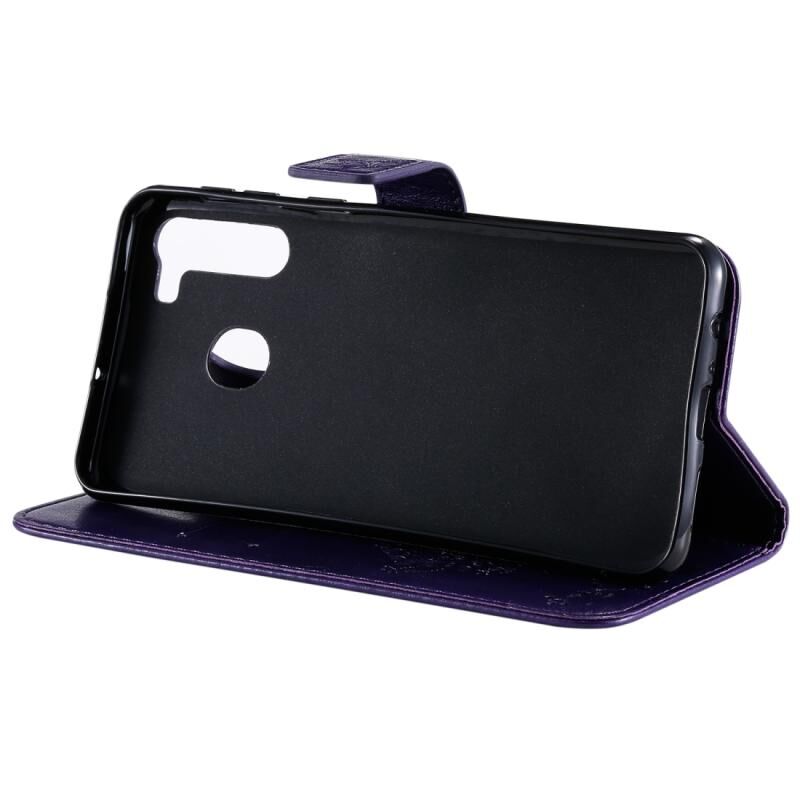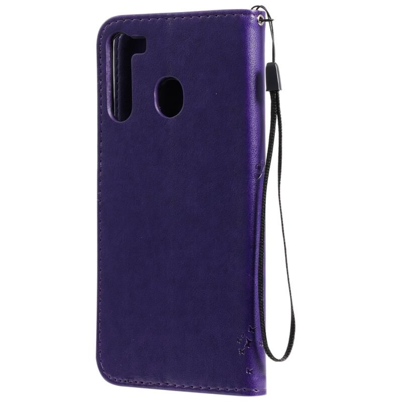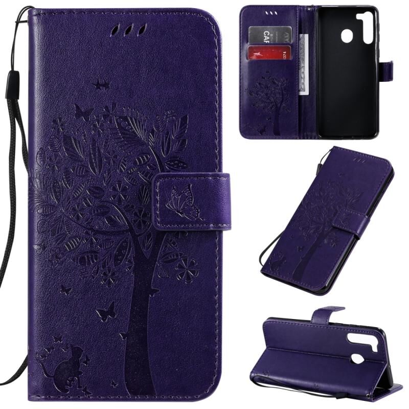 Θήκη για Galaxy A21 με σχέδιο Δέντρου & Γάτας, εκτύπωση με πίεση, οριζόντια, από δερματίνη PU με βάση & θήκες για κάρτες & πορτοφόλι & κορδόνι (Μωβ)