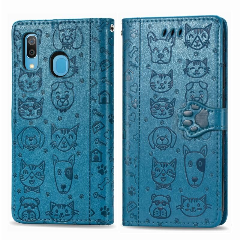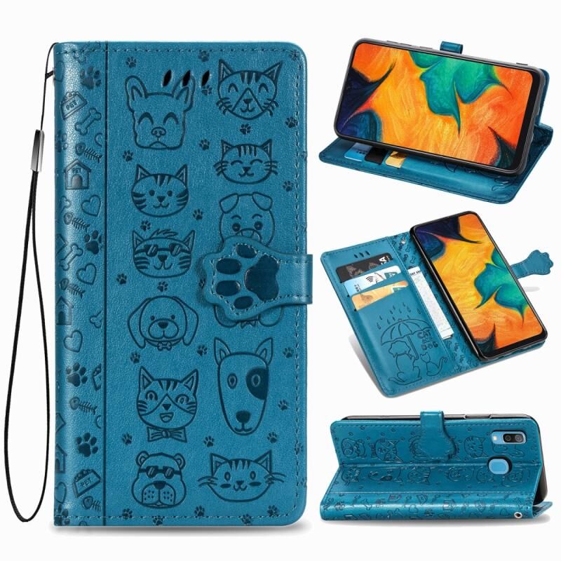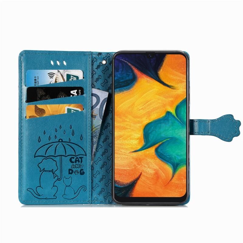 Θήκη δέρματος οριζόντιας αναδίπλωσης με ανάγλυφα σχέδια χαριτωμένων γάτας και σκύλου για Galaxy A30, με βάση στήριξης / υποδοχή κάρτας / πορτοφόλι / κορδόνι (Χρυσό)