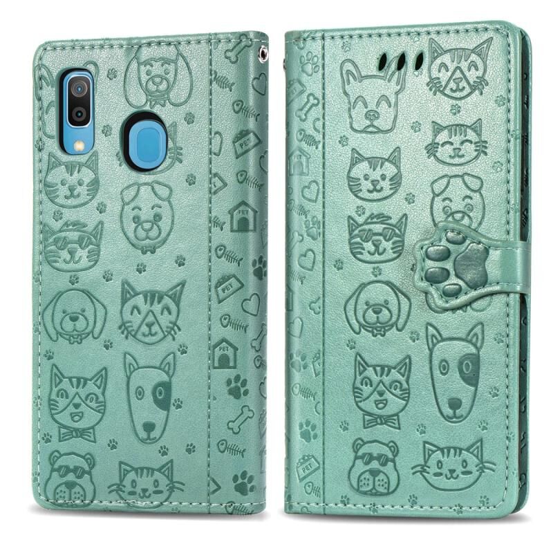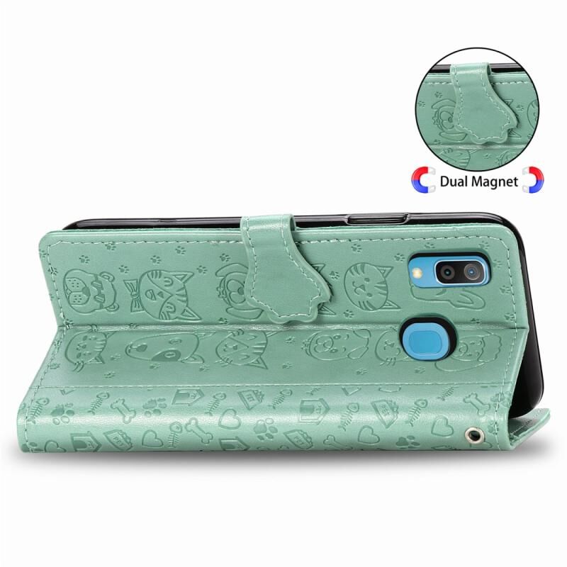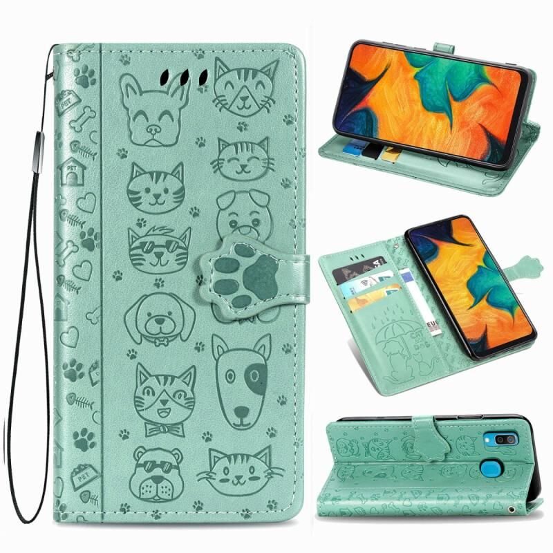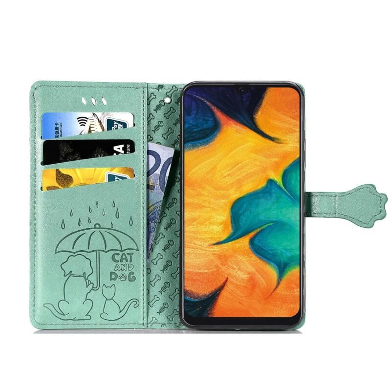Θήκη δέρματος οριζόντιας αναδίπλωσης με ανάγλυφα σχέδια χαριτωμένων γάτας και σκύλου για Galaxy A30, με βάση στήριξης / υποδοχή κάρτας / πορτοφόλι / κορδόνι (Ροζ)