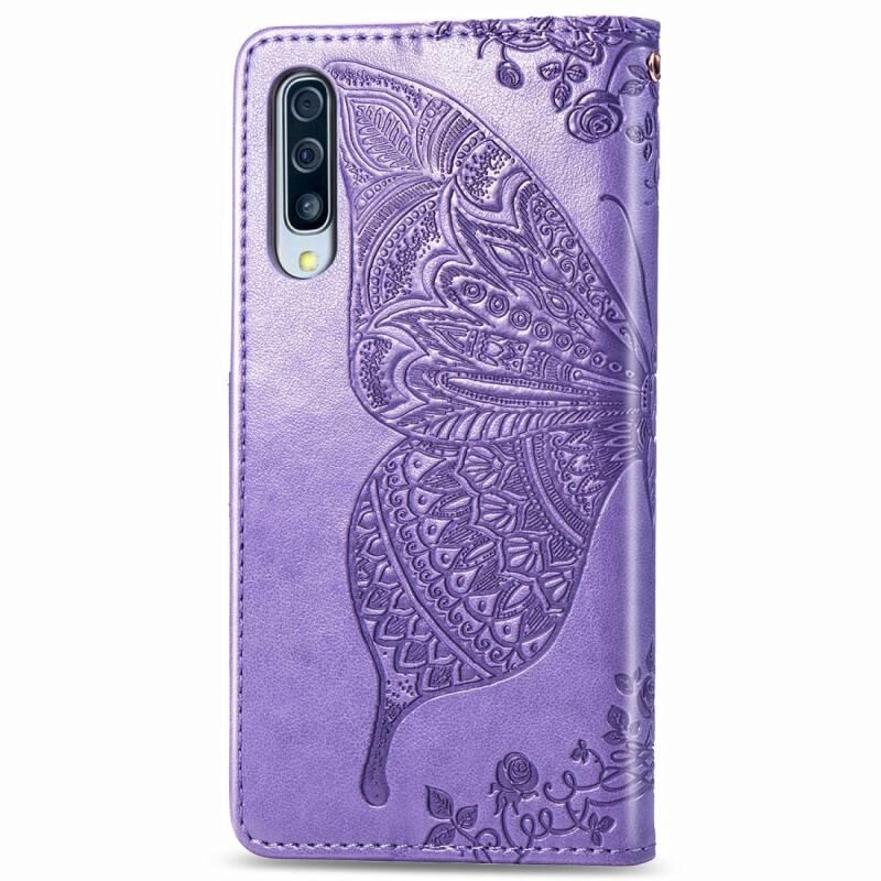 Θήκη βιβλίου από δέρμα με οριζόντιο άνοιγμα για Galaxy A30S με ανάγλυφο σχέδιο πεταλούδας και λουλουδιών, με βάση στήριξης / υποδοχή κάρτας / πορτοφόλι / κορδόνι (ανοιχτό μωβ)