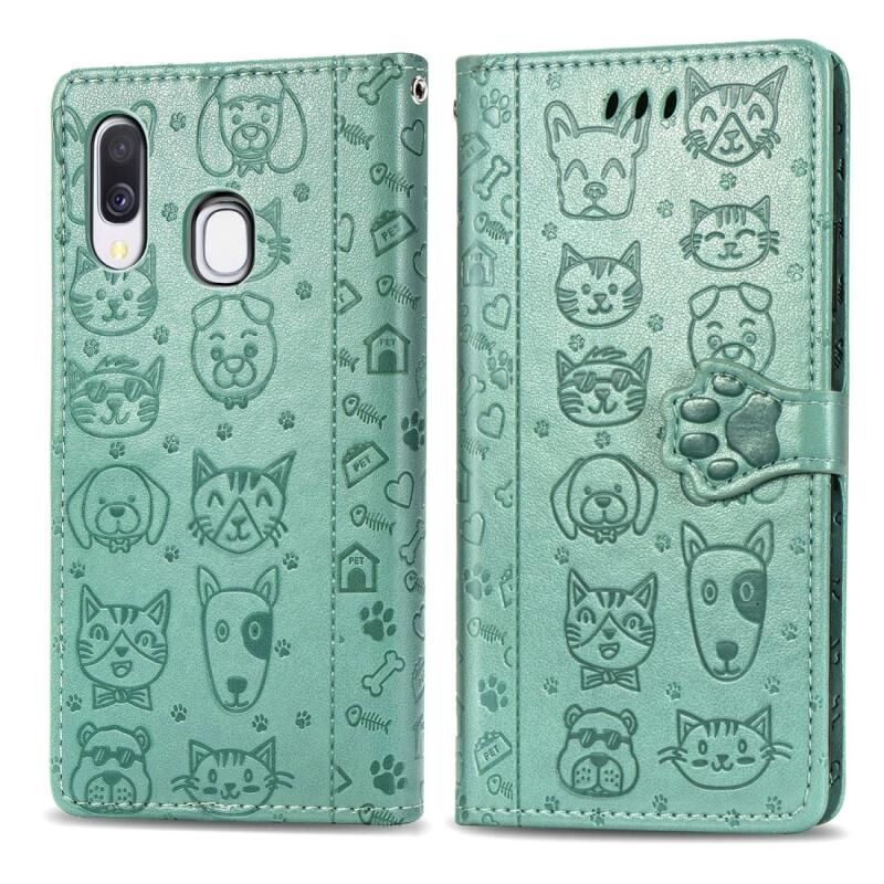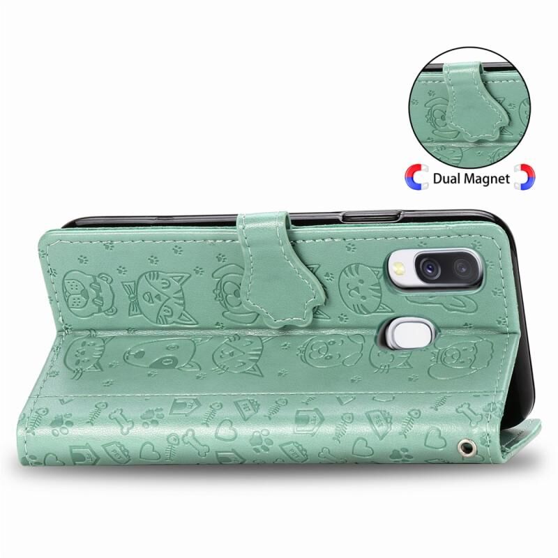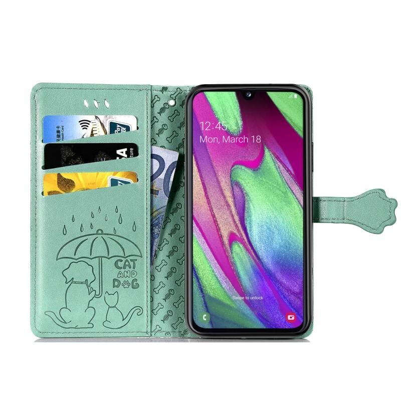 Θήκη δέρματος οριζόντιας αναδίπλωσης με ανάγλυφα σχέδια χαριτωμένων γάτας και σκύλου για Galaxy A40, με βάση στήριξης / υποδοχή κάρτας / πορτοφόλι / κορδόνι (Ροζ)