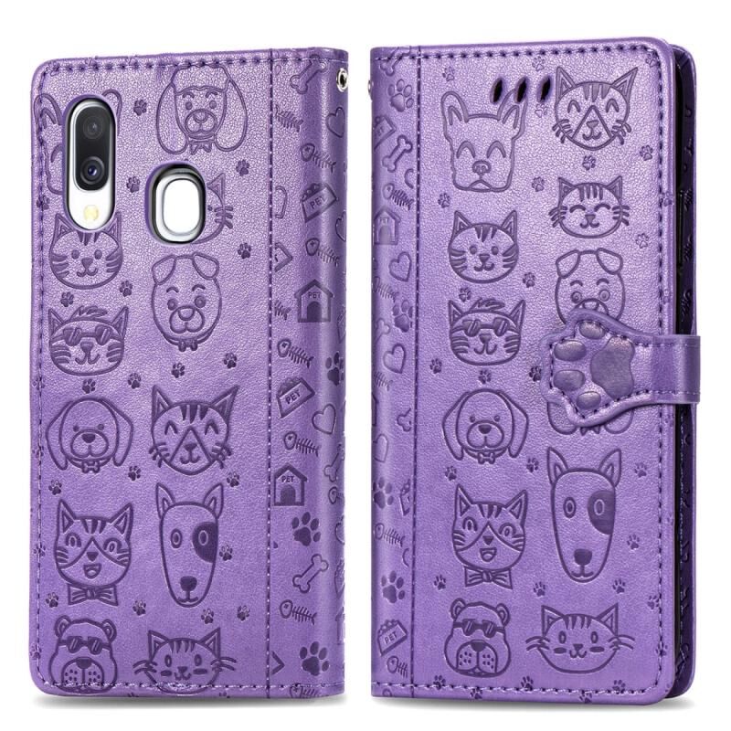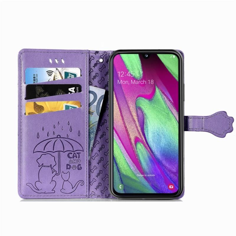 Θήκη δέρματος οριζόντιας αναδίπλωσης με ανάγλυφα σχέδια χαριτωμένων γάτας και σκύλου για Galaxy A40, με βάση στήριξης / υποδοχή κάρτας / πορτοφόλι / κορδόνι (Χρυσό ροζ)