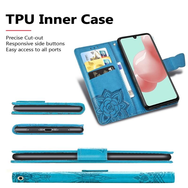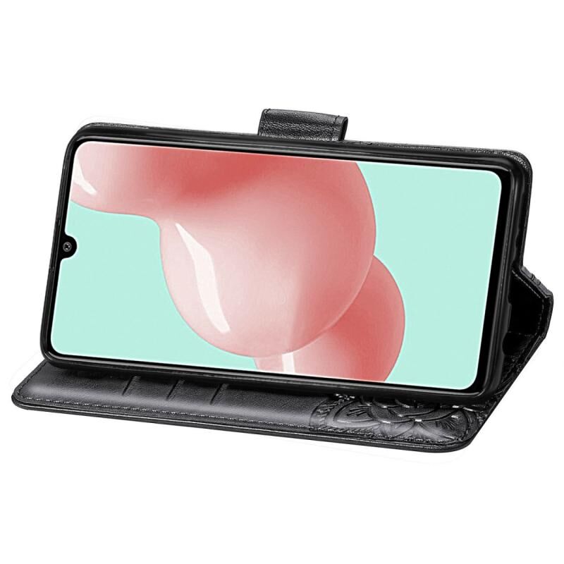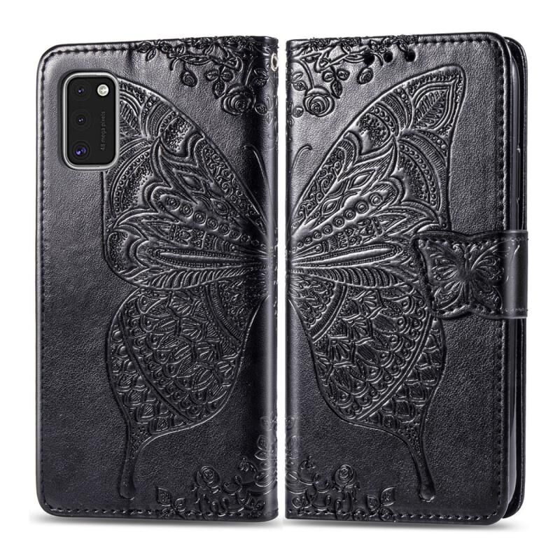 Θήκη βιβλίου από δέρμα με οριζόντιο άνοιγμα για Galaxy A41 με ανάγλυφο σχέδιο πεταλούδας και λουλουδιών, με βάση στήριξης / υποδοχή κάρτας / πορτοφόλι / κορδόνι (Μαύρο)