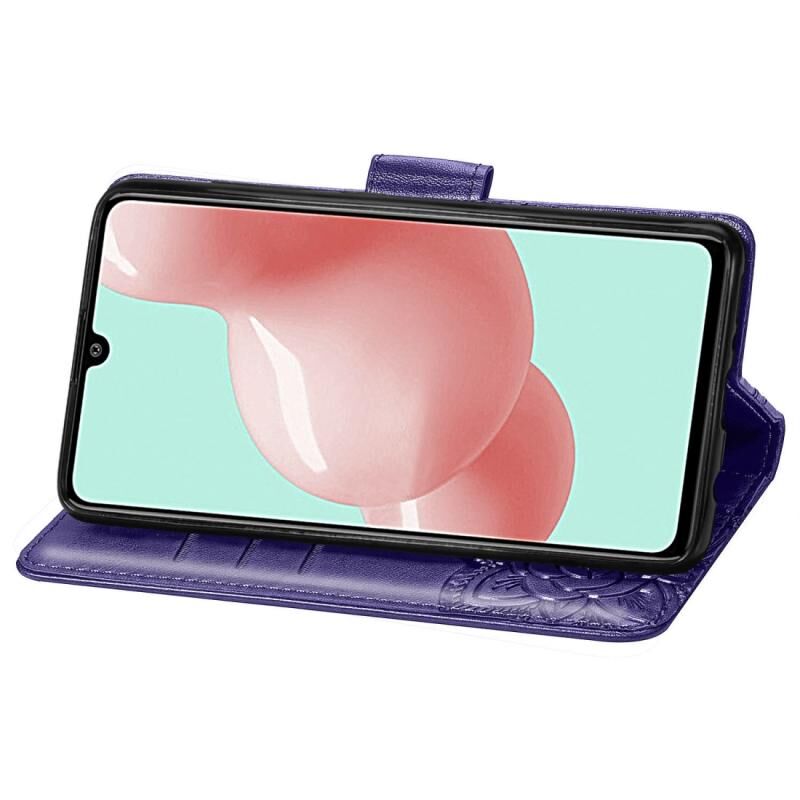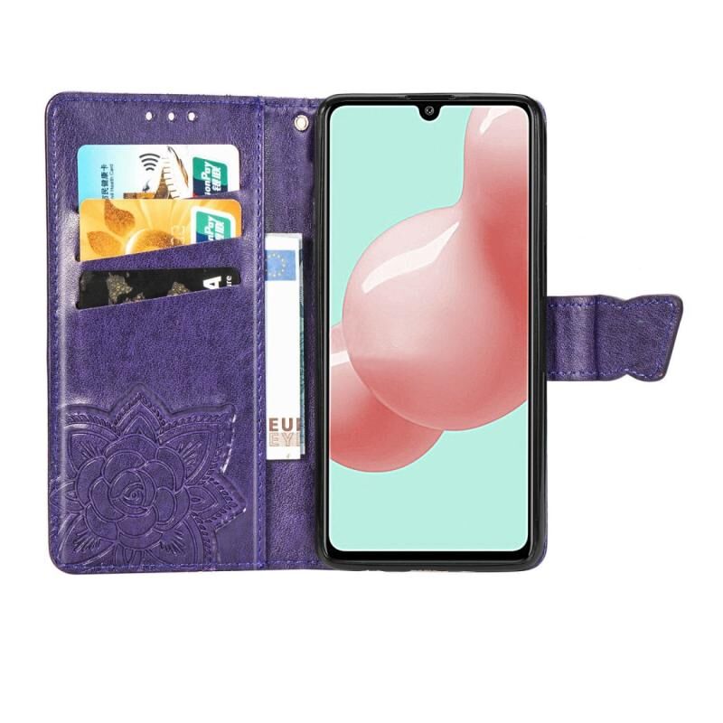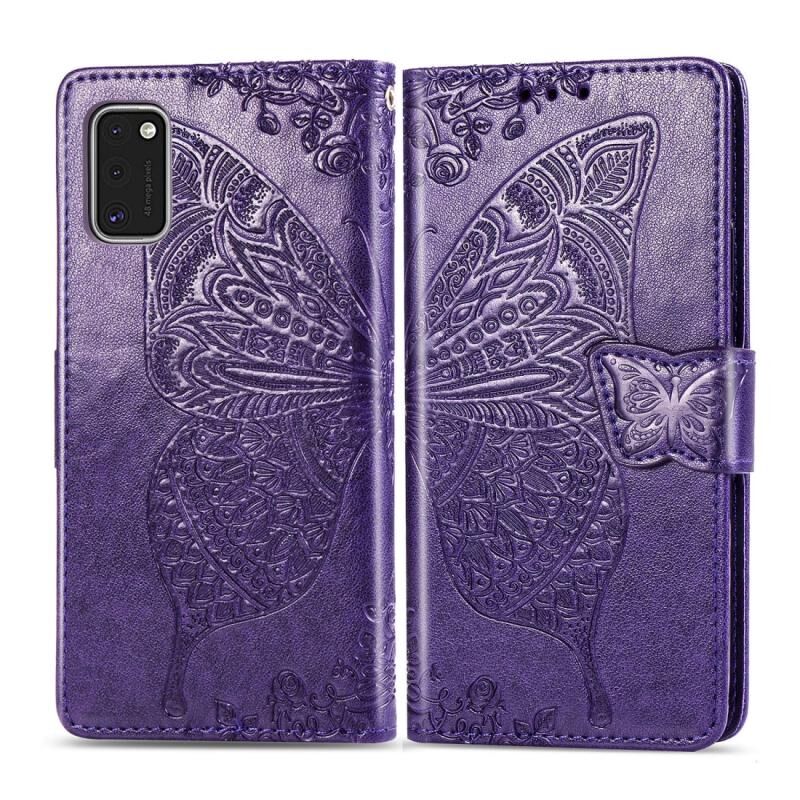 Θήκη βιβλίου από δέρμα με οριζόντιο άνοιγμα για Galaxy A41 με ανάγλυφο σχέδιο πεταλούδας και λουλουδιών, με βάση στήριξης / υποδοχή κάρτας / πορτοφόλι / κορδόνι (Σκούρο μωβ)