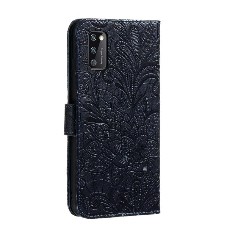 Θήκη για Galaxy A41, δερμάτινη οριζόντια με σχέδιο δαντέλας και ανάγλυφο λουλούδι, με βάση, θήκες για κάρτες, πορτοφόλι, κορνίζα φωτογραφιών και κορδόνι (Μαύρο)
