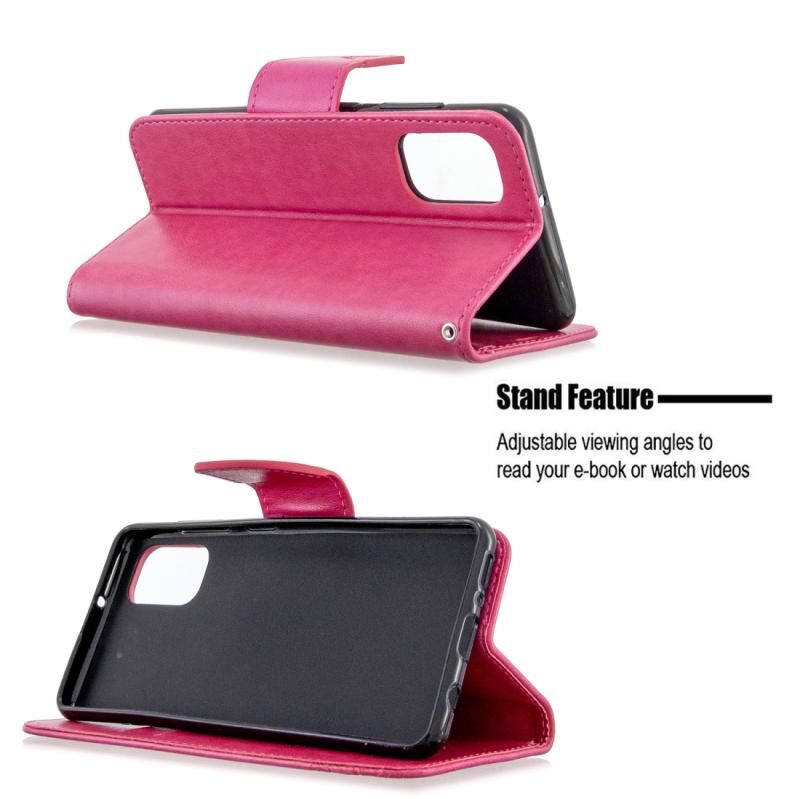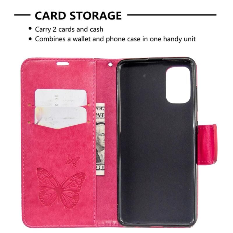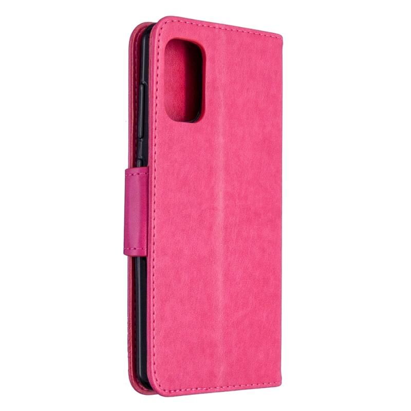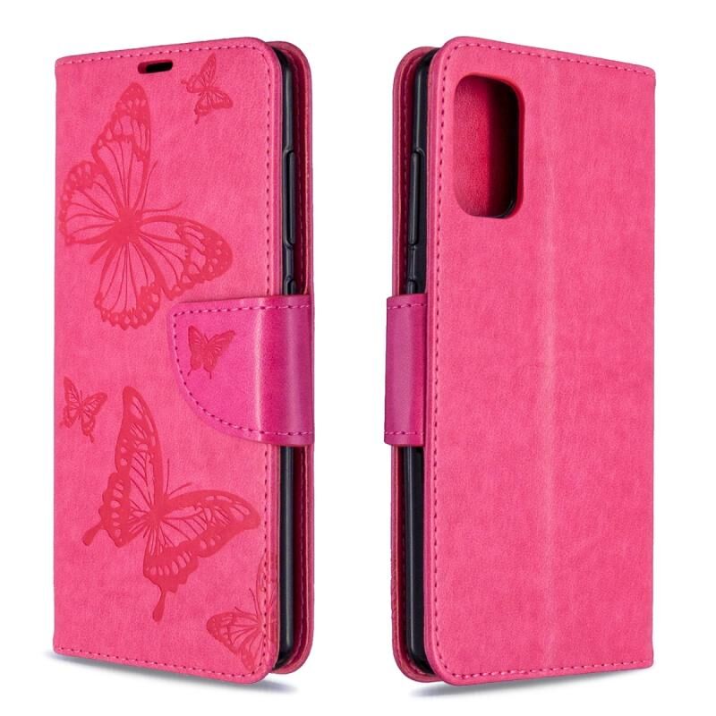 Θήκη βιβλίου από δέρμα με οριζόντιο άνοιγμα για Galaxy A41 με ανάγλυφο σχέδιο δύο πεταλούδων, με βάση, θήκη για κάρτες, πορτοφόλι και λουρί (Ροζέ κόκκινο)