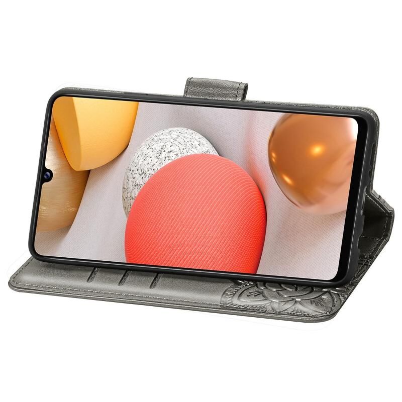 Θήκη βιβρίου από δέρμα με οριζόντιο άνοιγμα για Galaxy A42 5G με ανάγλυφο σχέδιο πεταλούδας και λουλουδιών, με βάση στήριξης / υποδοχή κάρτας / πορτοφόλι / κορδόνι (Μαύρο)
