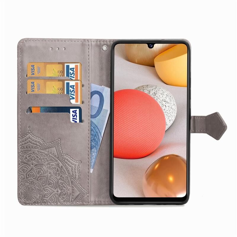 Θήκη βιβρίου από δέρμα με οριζόντιο άνοιγμα για Galaxy A42 5G, με ανάγλυφο σχέδιο Mandala, βάση στήριξης / υποδοχή κάρτας / πορτοφόλι / κορδόνι (Χρυσό Ρόδι)