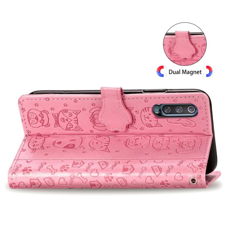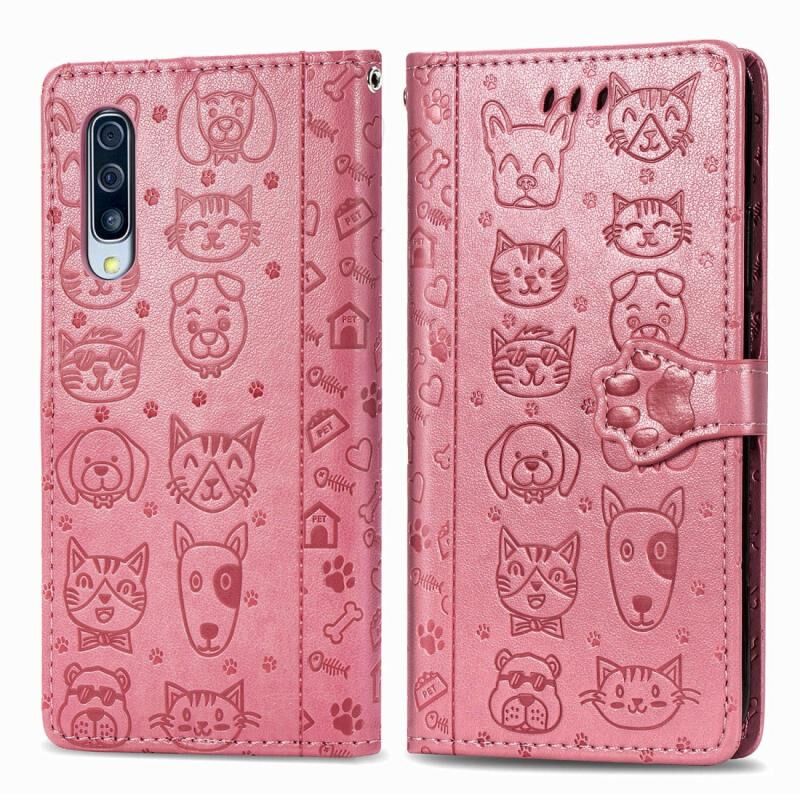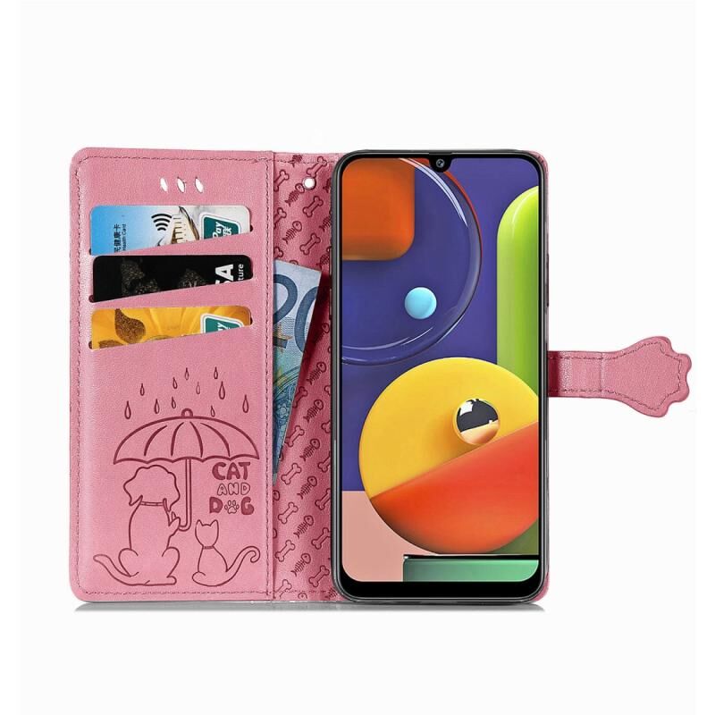 Θήκη δέρματος οριζόντιας αναδίπλωσης με ανάγλυφα σχέδια χαριτωμένων γάτας και σκύλου για Galaxy A50/A30S/A50S με βάση / υποδοχή κάρτας / πορτοφόλι / κορδόνι (Ροζ)