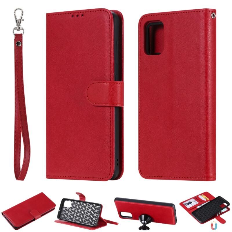 Για Galaxy A51 2 σε 1 Αμιγές χρώμα Αποσπώμενη PU δερμάτινη θήκη με υποδοχές καρτών & μαγνητική θήκη & πλαίσιο φωτογραφιών & πορτοφόλι & λουράκι (κόκκινο)