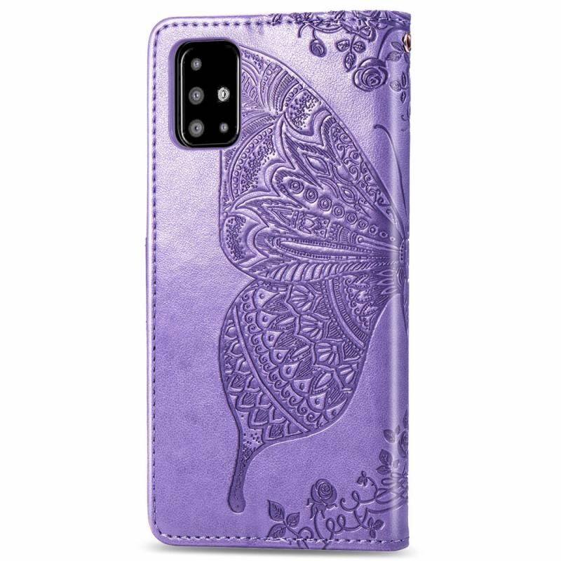 Θήκη βιβλίου από δέρμα με οριζόντιο άνοιγμα για Galaxy A51 με ανάγλυφο σχέδιο πεταλούδας και λουλουδιών, με βάση στήριξης / υποδοχή κάρτας / πορτοφόλι / κορδόνι (ανοιχτό μωβ)