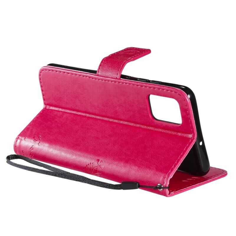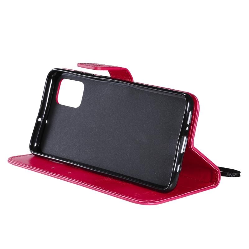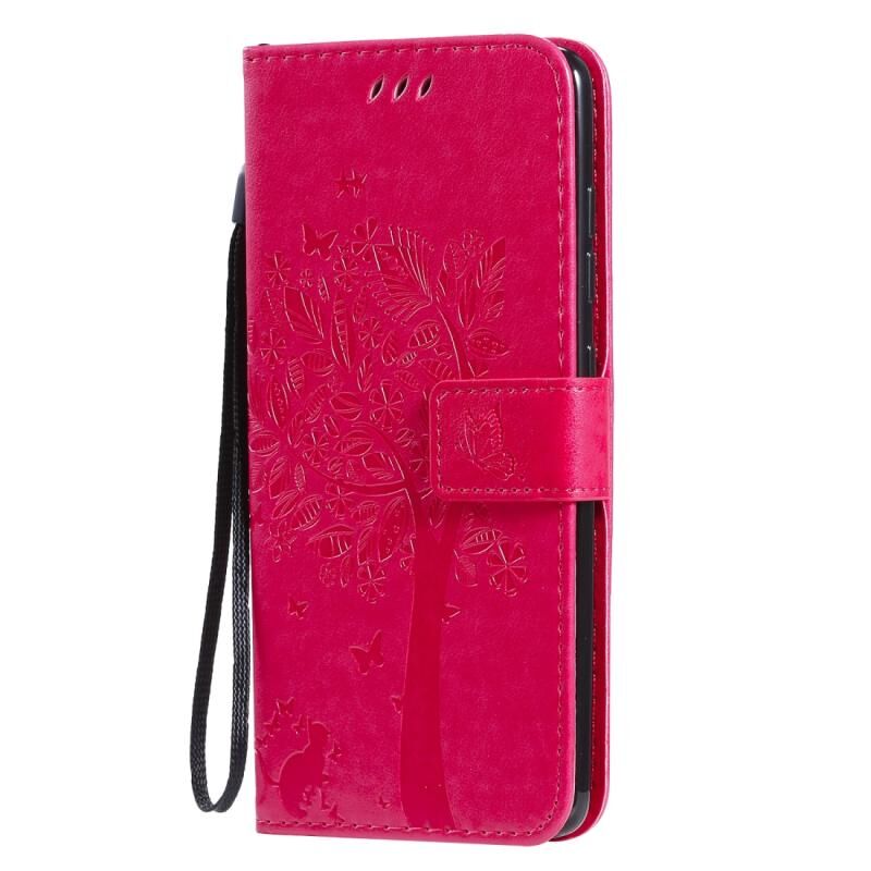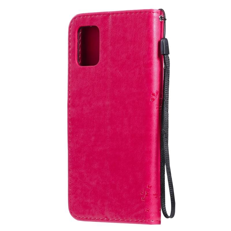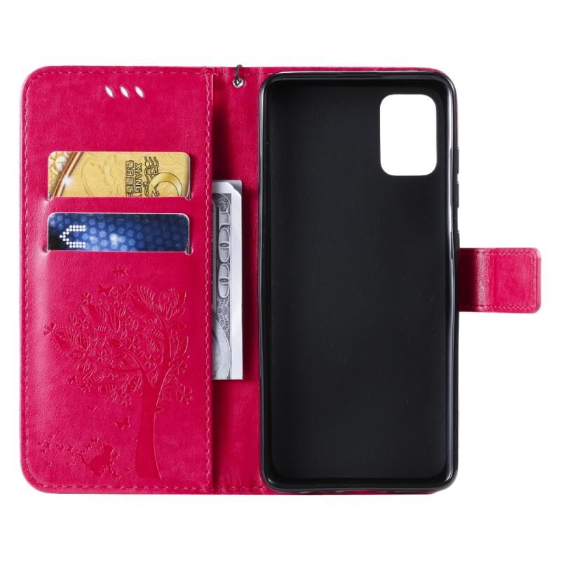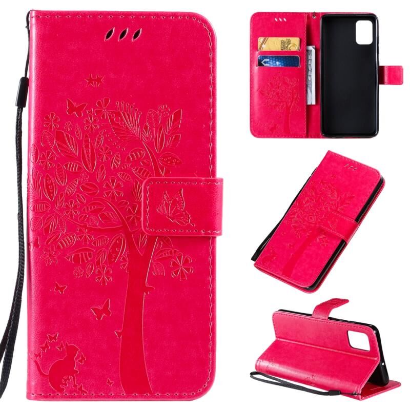 Θήκη για Galaxy A51 με σχέδιο Δέντρου & Γάτας, εκτύπωση με πίεση, οριζόντια, από δερματίνη PU με βάση & θήκες για κάρτες & πορτοφόλι & κορδόνι (Κόκκινο Ρόδο)