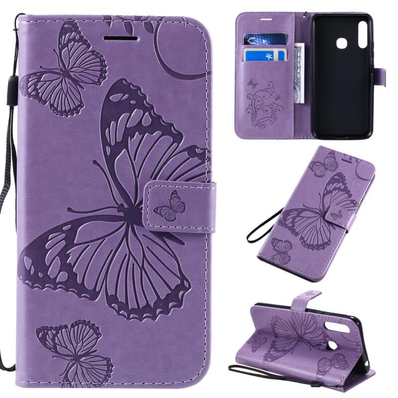 Θήκη δέρματος οριζόντιας αναδίπλωσης με ανάγλυφο σχέδιο 3D πεταλούδων για Galaxy A70e, με βάση, θήκη καρτών, πορτοφόλι και λουρί (Μωβ)