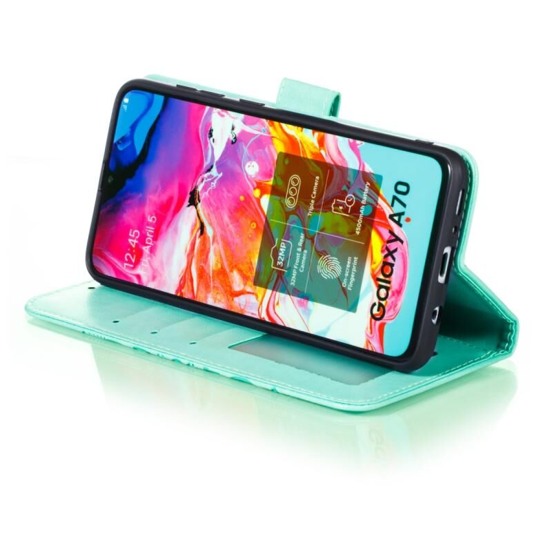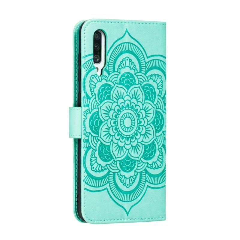 Θήκη βιβρίου από δέρμα με οριζόντιο άνοιγμα για Galaxy A70s με σχέδιο Mandala σε ανάγλυφο, με βάση, θήκες για κάρτες, πορτοφόλι, κορνίζα φωτογραφιών και κορδόνι (πράσινο)