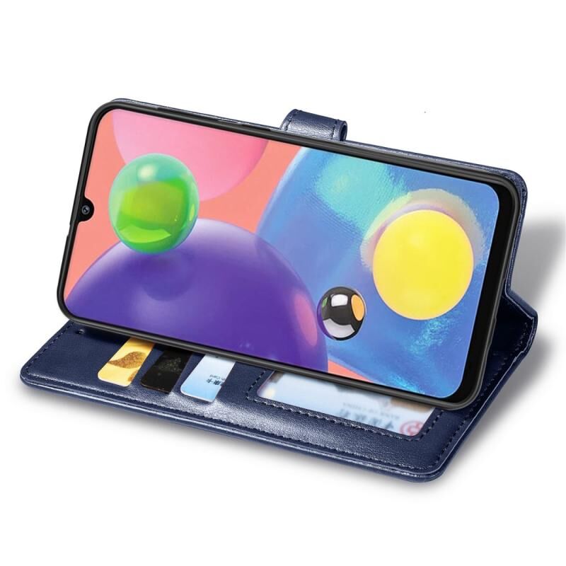 Για Galaxy A70s Ρετρό Αμιγές χρώμα δερμάτινη θήκη τηλεφώνου με αγκράφα & κορνίζα φωτογραφιών & υποδοχή κάρτας & πορτοφόλι & λειτουργία Stand (μπλε)