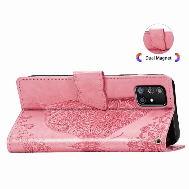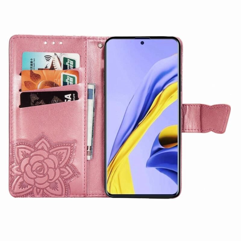 Θήκη βιβρίου από δέρμα με οριζόντιο άνοιγμα για Galaxy A71 5G με ανάγλυφο σχέδιο πεταλούδας και λουλουδιών, με βάση στήριξης / υποδοχή κάρτας / πορτοφόλι / κορδόνι (Ροζ)