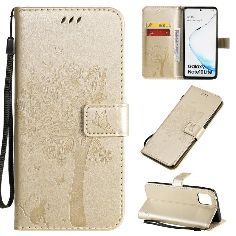 Θήκη για Galaxy A81 / M60S με σχέδιο Δέντρου & Γάτας, εκτύπωση με πίεση, οριζόντια, από δερματίνη PU με βάση & θήκες καρτών & πορτοφόλι & κορδόνι (Χρυσός)