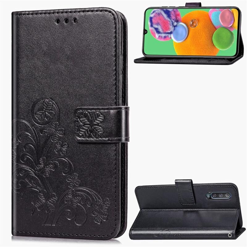 Για Galaxy A90 5G Δερμάτινη θήκη προστασίας κινητού τηλεφώνου με κουμπωτό κούμπωμα σε σχήμα τριφυλλιού, λουρί, θήκη για κάρτες, πορτοφόλι και λειτουργία βάσης (Μαύρο)