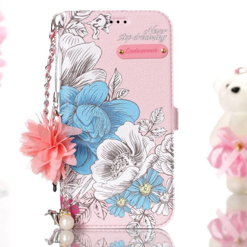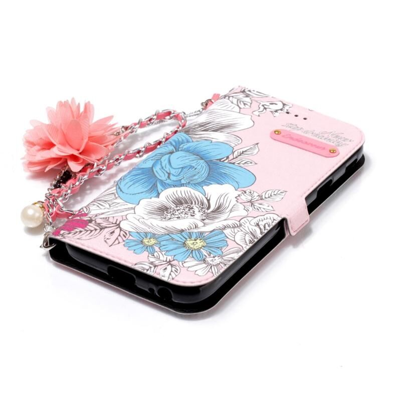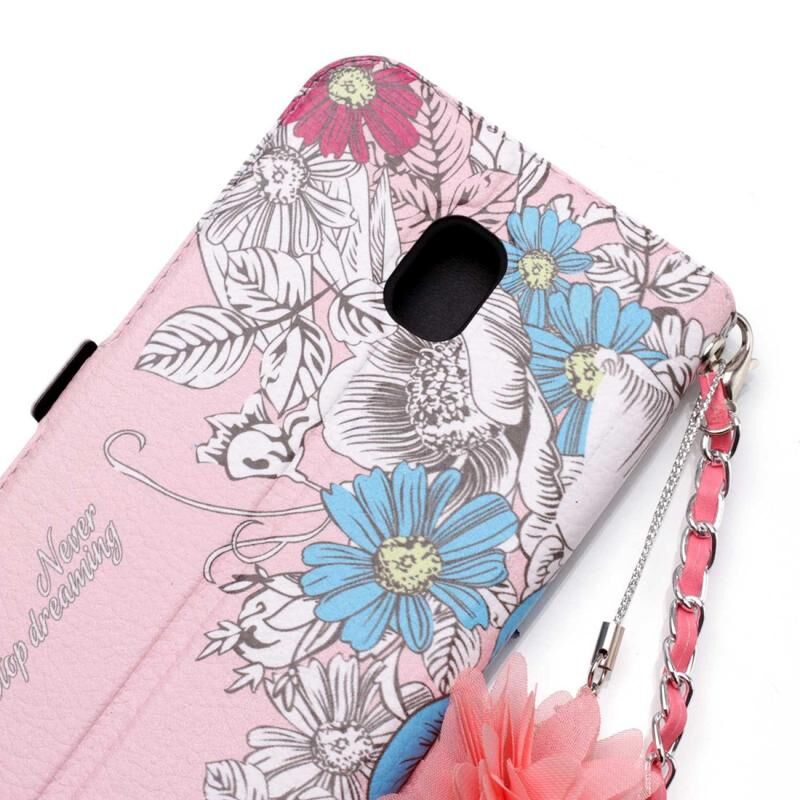 Για το Galaxy J3 (2017) (έκδοση ΕΕ) Ροζ φόντο μπλε Rose μοτίβο οριζόντια Flip δερμάτινη θήκη με θήκη & υποδοχές για κάρτες & μαργαριτάρι λουλούδι στολίδι & αλυσίδα