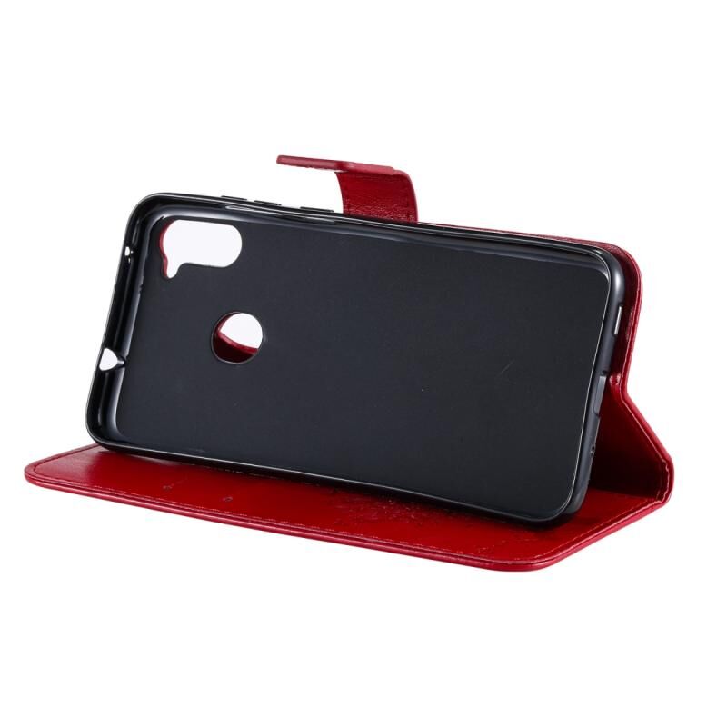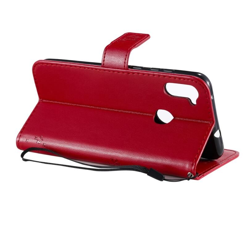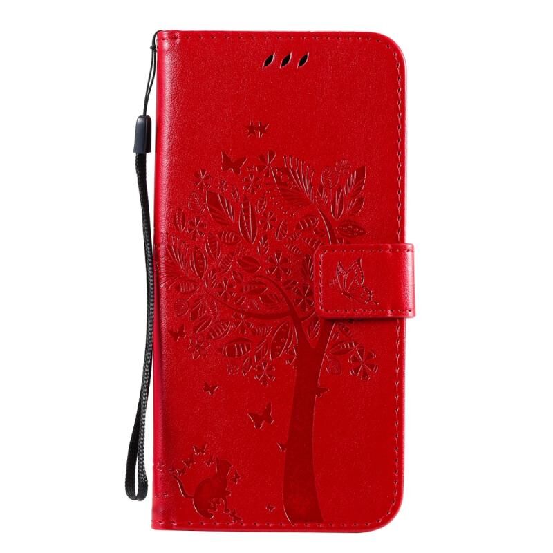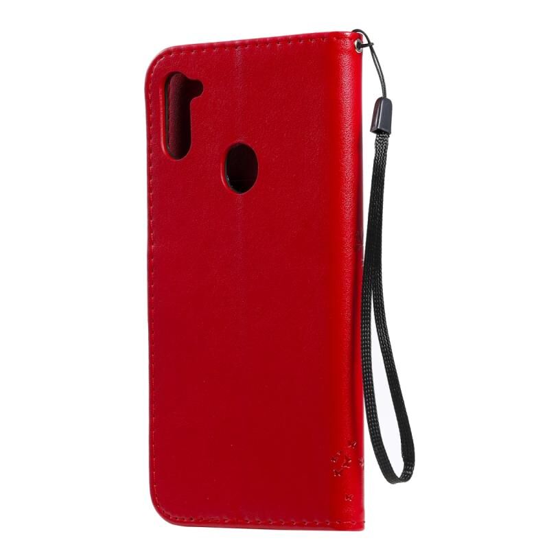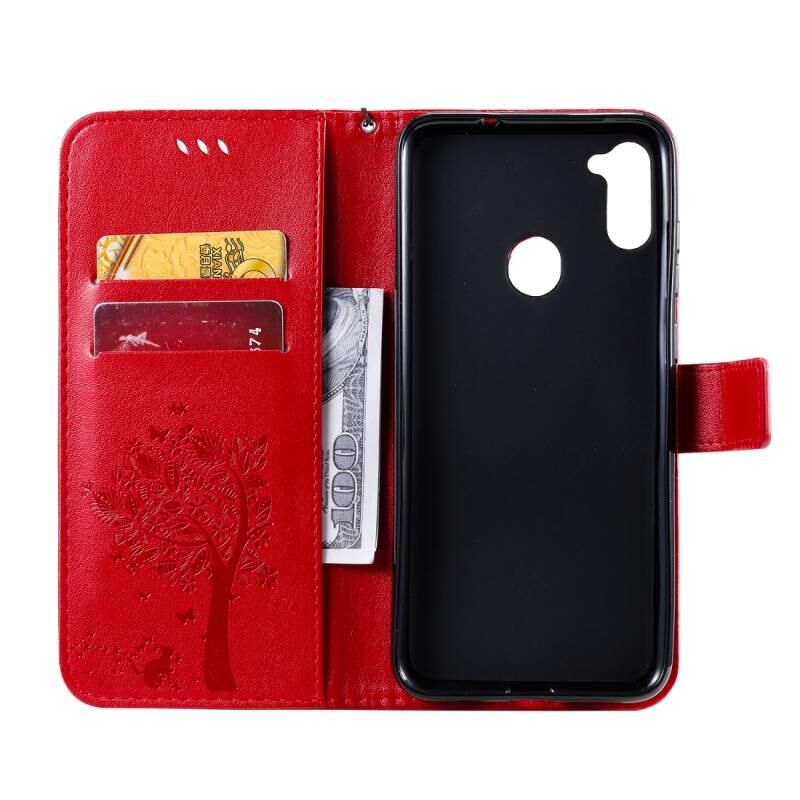 Θήκη για Galaxy M11 / A11 με σχέδιο Δέντρου & Γάτας, εκτύπωση με πίεση, οριζόντια αναδιπλούμενη από δερματίνη PU με βάση στήριξης & θήκες καρτών & πορτοφόλι & κορδόνι (Κόκκινο)
