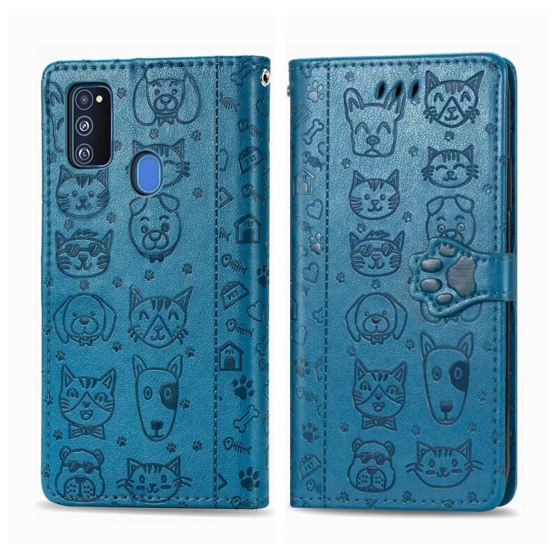 Θήκη δέρματος οριζόντιας αναδίπλωσης με ανάγλυφα σχέδια χαριτωμένων γάτας και σκύλου για Galaxy M30S, με βάση / υποδοχή κάρτας / πορτοφόλι / κορδόνι (Μπλε)