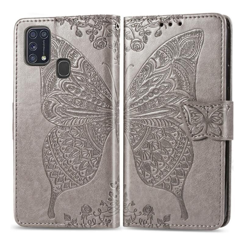 Θήκη δέρματος οριζόντιας αναδίπλωσης για Galaxy M31 με ανάγλυφο σχέδιο πεταλούδας και λουλουδιών, με βάση στήριξης / υποδοχή κάρτας / πορτοφόλι / κορδόνι (Γκρι)